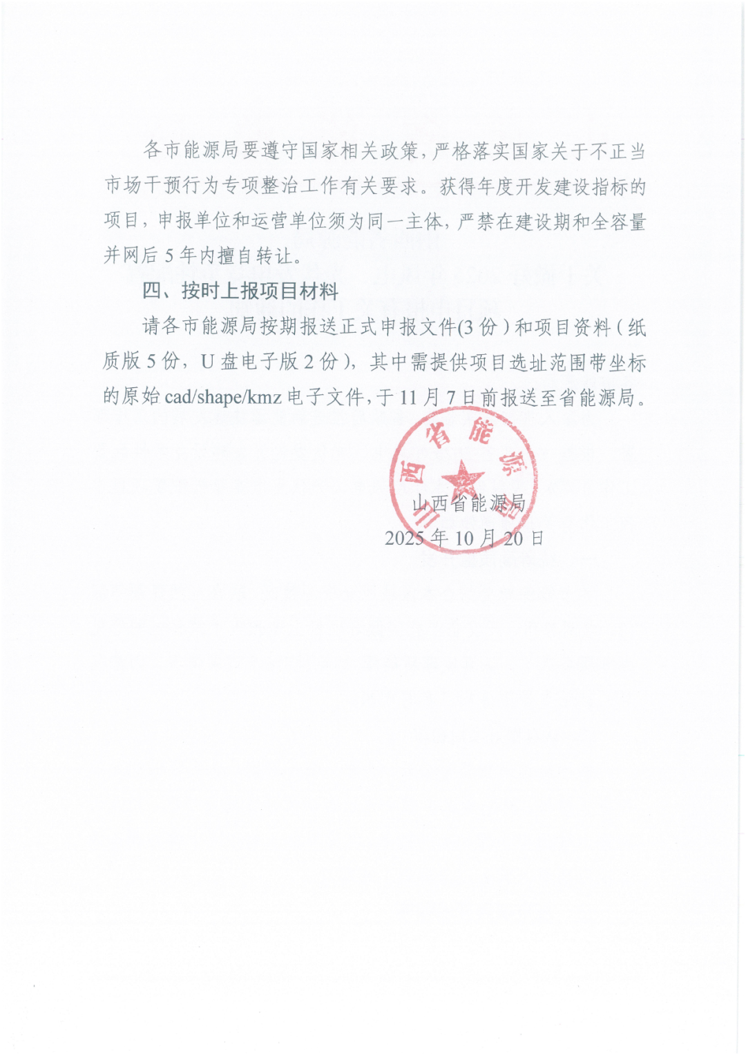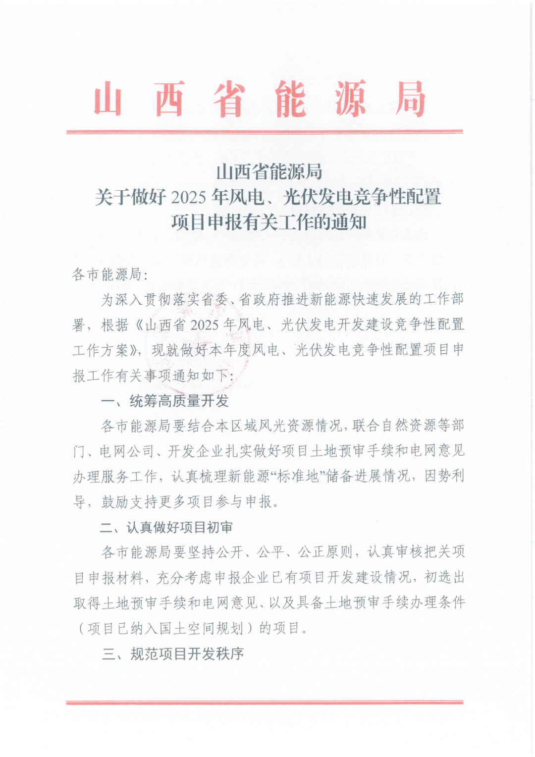 10月20日,山西省能源局印發(fā)《關(guān)于做好2025年風(fēng)電、光伏發(fā)電競(jìng)爭(zhēng)性配置項(xiàng)目申報(bào)有關(guān)工作的通知》。通知指出,各市能源局要結(jié)合本區(qū)域風(fēng)光資源情況,聯(lián)合自然資源等部門、電網(wǎng)公司、開發(fā)企業(yè)扎實(shí)做好項(xiàng)目土地預(yù)審手續(xù)和電網(wǎng)意見辦理服務(wù)工作,認(rèn)真梳理新能源“標(biāo)準(zhǔn)地”儲(chǔ)備進(jìn)展情況,因勢(shì)利導(dǎo),鼓勵(lì)支持更多項(xiàng)目參與申報(bào)。 通知要求,各市能源局要遵守國(guó)家相關(guān)政策,嚴(yán)格落實(shí)國(guó)家關(guān)于不正當(dāng)市場(chǎng)干預(yù)行為專項(xiàng)整治工作有關(guān)要求。獲得年度開發(fā)建設(shè)指標(biāo)的項(xiàng)目,申報(bào)單位和運(yùn)營(yíng)單位須為同一主體,嚴(yán)禁在建設(shè)期和全容量并網(wǎng)后5年內(nèi)擅自轉(zhuǎn)讓。 詳情見下: