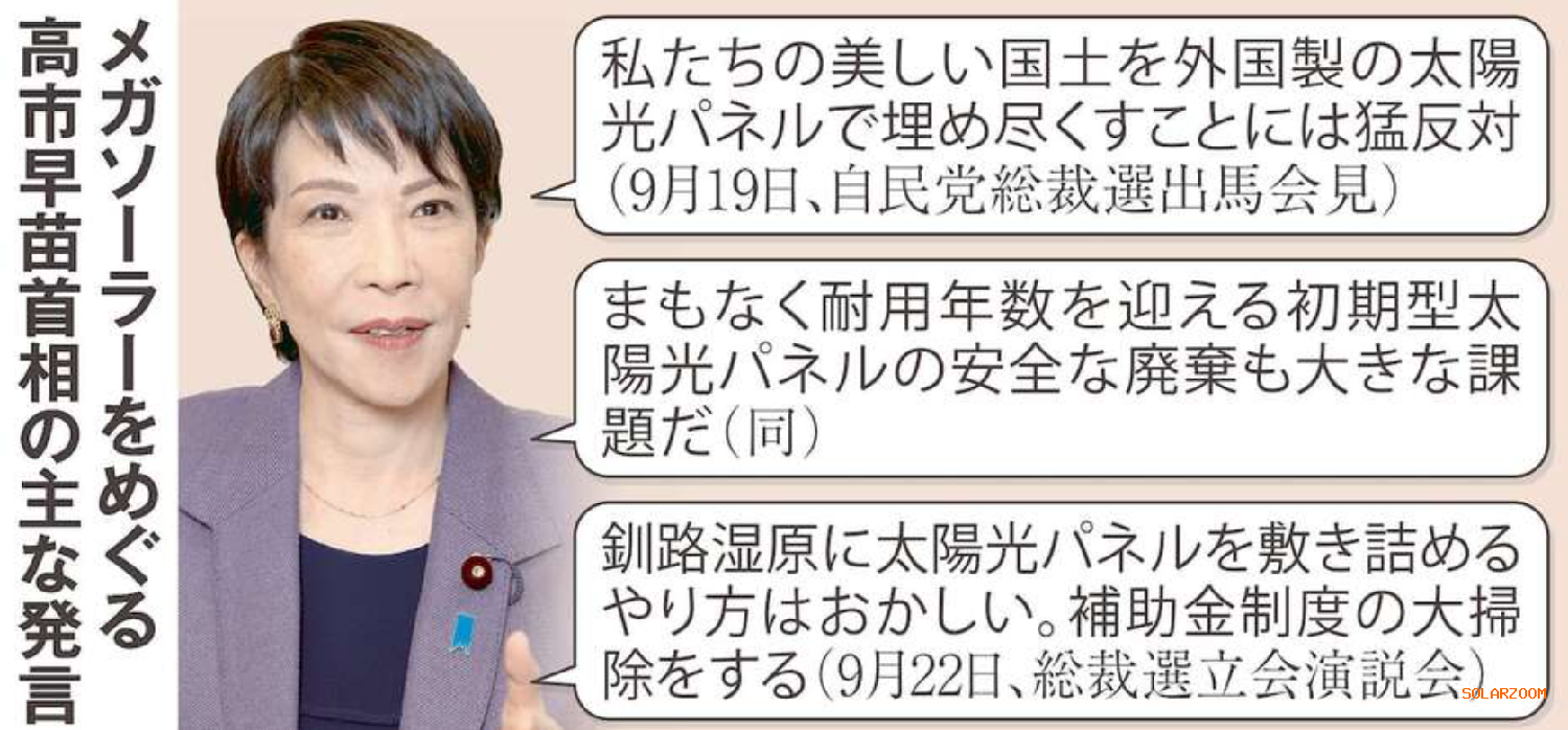 高市早苗在黨首選舉期間曾強(qiáng)烈批評(píng)“讓外國制造的太陽能板覆蓋日本國土”的現(xiàn)象,并主張重新審視補(bǔ)貼制度。執(zhí)政聯(lián)盟在政策協(xié)議中提出,要重點(diǎn)推動(dòng)日本具有優(yōu)勢的可再生能源開發(fā),尤其是地?zé)岚l(fā)電。新任環(huán)境大臣石原宏高強(qiáng)調(diào),應(yīng)嚴(yán)格限制導(dǎo)致自然破壞的“惡性太陽能項(xiàng)目”,而副環(huán)境大臣青山繁晴則長期主張關(guān)注太陽能廢棄物等負(fù)面問題,顯示政府將全面強(qiáng)化監(jiān)管。 自2012年固定價(jià)格收購制度實(shí)施以來,太陽能發(fā)電設(shè)施迅速擴(kuò)張,全國已有超過300個(gè)地方政府制定獨(dú)自條例。北海道釧路市本月起實(shí)施新規(guī),對(duì)濕地周邊劃定特別保全區(qū),要求事前申報(bào)并公布違規(guī)企業(yè);和歌山縣則規(guī)定大規(guī)模項(xiàng)目須獲知事認(rèn)證。 然而,多數(shù)地方仍缺乏足夠法源,僅能呼吁中央立法。政府已于9月成立跨部門會(huì)議,研究通過國家法律限制濫建。高市首相表示,將在確保能源安全的前提下,尋求太陽能與火力發(fā)電之間的平衡,以防“再生能源過度依賴”造成電力不穩(wěn)。