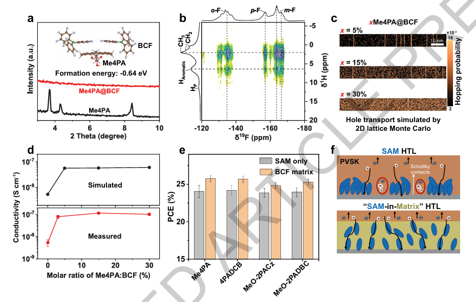 金屬鹵化物鈣鈦礦因其卓越的光電性能,已成為推動(dòng)光伏效率進(jìn)步的有力競(jìng)爭(zhēng)者。隨著研究型電池的光電轉(zhuǎn)換效率(PCE)最新記錄已媲美商業(yè)化硅電池,鈣鈦礦太陽(yáng)能電池(PSCs)的產(chǎn)業(yè)化已近在眼前。然而,大多數(shù)采用自組裝分子(SAMs)的高效倒置鈣鈦礦太陽(yáng)能電池面臨分子聚集和疏水性等問(wèn)題。 本研究上海交通大學(xué)趙一新、陳悅天、郭永勝和繆炎峰等人提出了一種“SAM-in-matrix”策略,將部分SAM分散于穩(wěn)定的三(五氟苯基)硼烷(BCF)基質(zhì)中,有效打破了原有分子堆疊導(dǎo)致的聚集現(xiàn)象。二維晶格蒙特卡洛模擬與實(shí)驗(yàn)結(jié)果均表明,該策略可形成高效的電荷傳輸通道?;诖恕癝AM-in-matrix”空穴傳輸層(HTL)的器件,在不同SAM體系中均展現(xiàn)出更高的效率、更致密的表面覆蓋、良好的導(dǎo)電性,并顯著減少了埋底納米空隙。此外,該策略在規(guī)?;苽渲姓宫F(xiàn)出顯著的應(yīng)用潛力。在FTO/NiO?基底上構(gòu)建的“SAM-in-matrix” HTL有助于形成高質(zhì)量的大面積鈣鈦礦薄膜,并提升NiO?的導(dǎo)電性。 最終,成功制備出1米×2米的大面積鈣鈦礦太陽(yáng)能組件,其認(rèn)證效率達(dá)到創(chuàng)紀(jì)錄的20.05%。 研究亮點(diǎn):