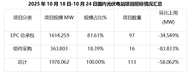 一、光伏項(xiàng)目招標(biāo)情況匯總: 根據(jù)Gessey蓋錫咨詢(xún)統(tǒng)計(jì),2025年10月18日-10月24日累計(jì)光伏招標(biāo)項(xiàng)目為113個(gè),項(xiàng)目規(guī)模合計(jì)為1978.062MW。光伏組件采購(gòu)招標(biāo)項(xiàng)目為16個(gè),招標(biāo)規(guī)模為363.803MW,環(huán)比上周-83.833%。EPC總承包招標(biāo)項(xiàng)目為97個(gè),招標(biāo)規(guī)模為1614.259MW,,環(huán)比上周-34.549%。