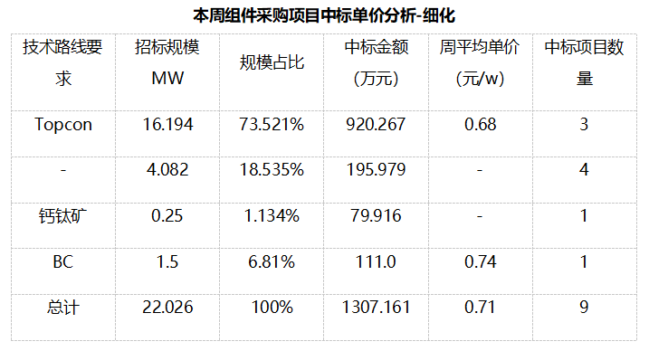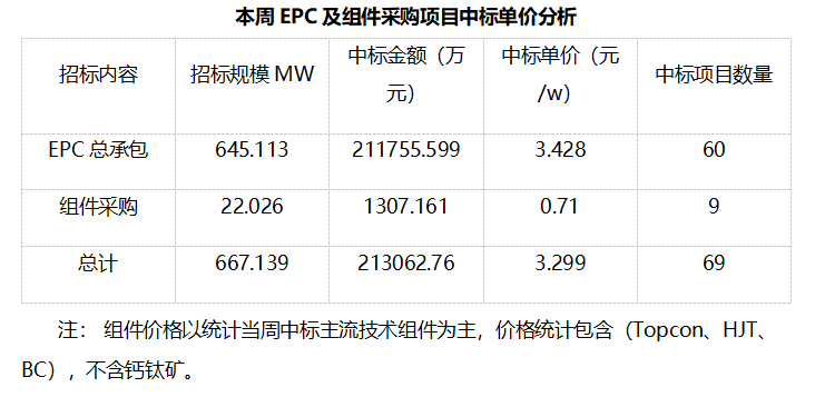 三、EPC總承包及組件采購(gòu)情況匯總 本周光伏EPC總承包中標(biāo)規(guī)模達(dá)645.113MW,總中標(biāo)金額211755.599萬(wàn)元,平均中標(biāo)單價(jià)為3.428元/W,中標(biāo)數(shù)量60個(gè)。 本周光伏組件采購(gòu)中標(biāo)規(guī)模達(dá)22.026MW,總中標(biāo)金額1307.161萬(wàn)元,平均中標(biāo)單價(jià)為0.71元/W,中標(biāo)數(shù)量9個(gè)。
