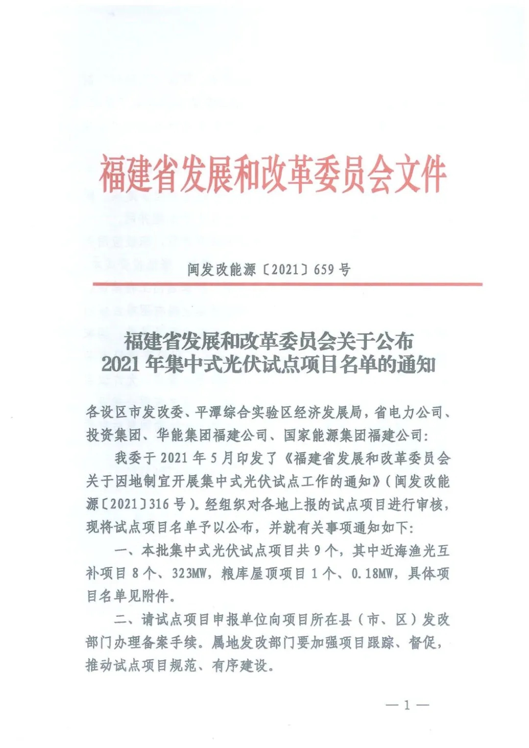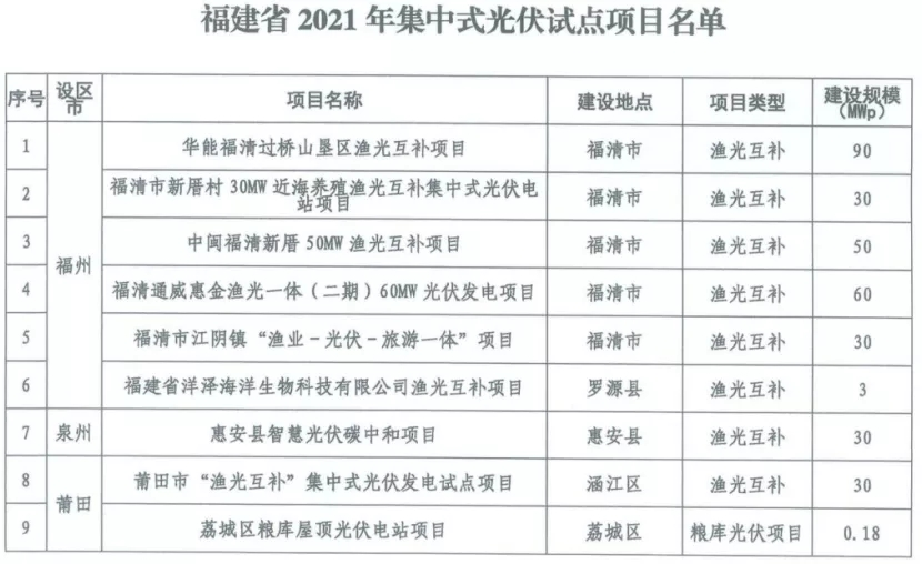 福建省發(fā)展和改革委員會公布了《2021年集中式光伏試點項目名單》的通知。本批集中式光伏試點項目共9個,其中近海漁光互補項目8個,規(guī)模323MW,糧庫屋頂項目1個,規(guī)模0.18MW。試點項目分別建設(shè)在福州、泉州、莆田三地。