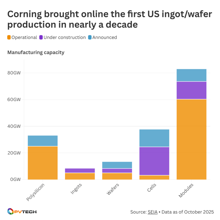 近十年來,美國首次實現(xiàn)國產(chǎn)太陽能硅片生產(chǎn)。 康寧今年多晶硅和硅片產(chǎn)能已全部售罄,且已鎖定未來五年超過80%的可用產(chǎn)能的采購訂單。 這一消息是在該公司公布在密歇根州建設(shè)太陽能硅錠和硅片制造廠計劃近一年后傳出的,該廠毗鄰其子公司Hemlock Semiconductor公司的多晶硅制造廠。 康寧公司總裁兼首席執(zhí)行官Wendell Weeks表示:“過去18個月里,我們在密歇根州赫姆洛克的多晶硅制造廠旁,建成了美國最大的太陽能硅錠和硅片工廠,這是一項重大舉措?!?/span> Wendell Weeks在財報電話會議上補充稱,公司將專注于硅錠和硅片業(yè)務(wù),同時從其他美國生產(chǎn)商處采購太陽能電池。他還表示:“我們也希望在組件市場占據(jù)一席之地,主要是因為我們有一些新的創(chuàng)新成果可以應(yīng)用于此,有望提高轉(zhuǎn)換效率,提供一些全球頂尖產(chǎn)品,甚至打造出全球最佳的太陽能產(chǎn)品,這是我們的期望?!?/span> 康寧公司硅片廠投產(chǎn)也標(biāo)志著美國太陽能硅片生產(chǎn)在近十年后重現(xiàn)。 PV Tech Research市場研究主管Moustafa Ramadan表示:“組件首次實現(xiàn)完全美國制造,從多晶硅到組件皆是如此。這可能是很久以來首次實現(xiàn)這一目標(biāo)。雖然這可能不足以滿足需求,但這是美國制造業(yè)的一大進步。 一個明顯的例子是今年8月康寧與美國太陽能制造商T1Energy簽署的供應(yīng)協(xié)議。根據(jù)協(xié)議,康寧將向T1 Energy供應(yīng)美國制造的多晶硅和硅片,T1Energy計劃于今年第四季度開始建設(shè)其5GW太陽能電池生產(chǎn)廠,并已開始在其達(dá)拉斯工廠組裝組件。 美國光伏組件年銘牌產(chǎn)能突破60GW 康寧公司密歇根州硅片廠投產(chǎn)是過去十二個月里美國太陽能制造業(yè)的最新里程碑。據(jù)美國太陽能產(chǎn)業(yè)協(xié)會(SEIA)數(shù)據(jù),去年年末,美國本土?xí)r隔五年首次實現(xiàn)太陽能電池生產(chǎn),目前年銘牌產(chǎn)能已達(dá)3.2GW,較2024年增長兩倍有余。 此外,今年2月,SEIA表示,美國光伏組件年銘牌產(chǎn)能已突破50GW,如下圖所示。自該消息公布以來,組件年銘牌產(chǎn)能又增加了10GW。