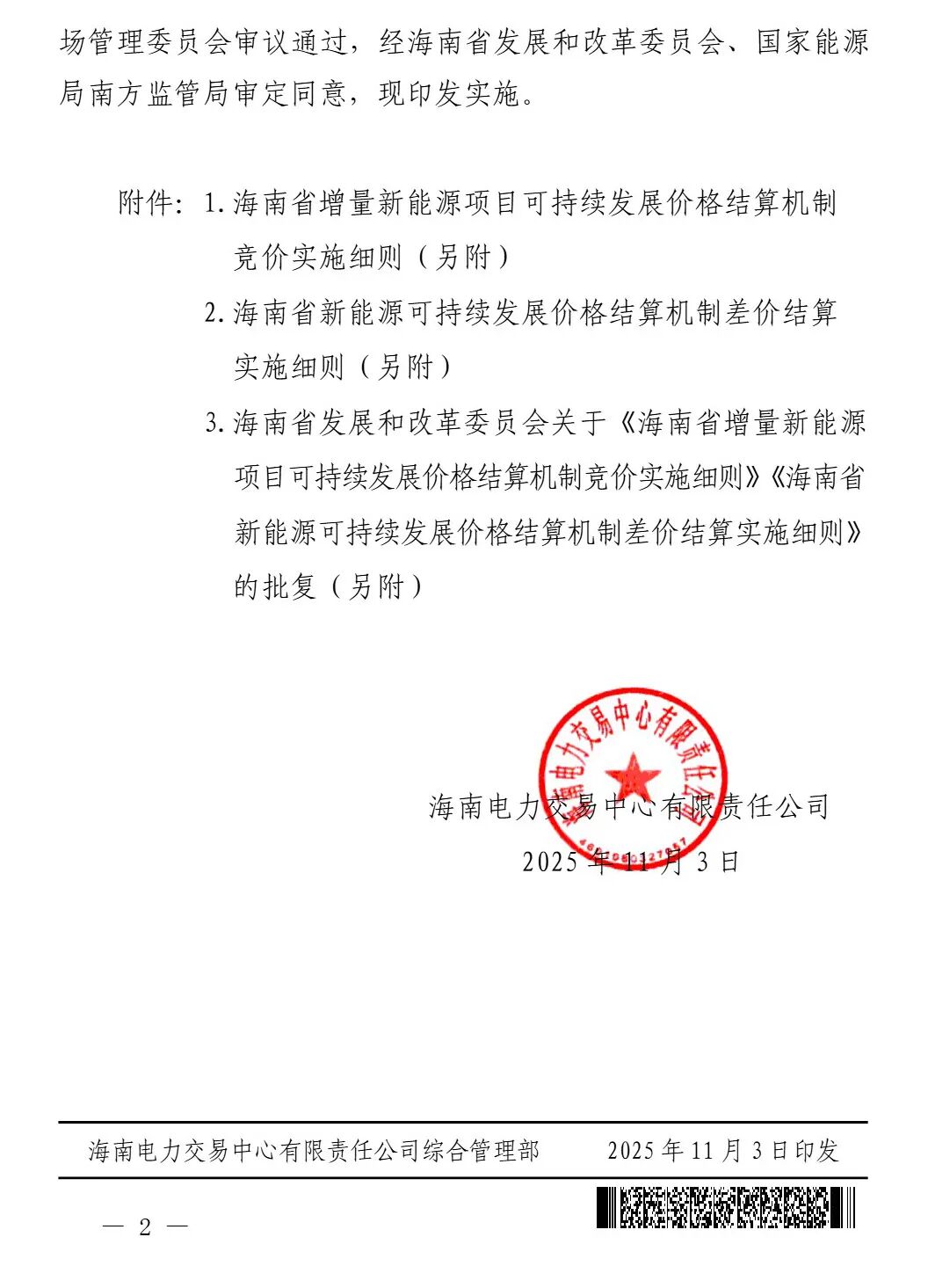 11月3日,海南電力交易中心印發(fā)海南省新能源上網(wǎng)電價(jià)市場(chǎng)化改革配套細(xì)則的通知,實(shí)施細(xì)則提到,適用于2025年6月1日及以后投產(chǎn)的且未納入機(jī)制執(zhí)行范圍的新能源項(xiàng)目(風(fēng)電、太陽(yáng)能發(fā)電項(xiàng)目,下同)。 選擇全部自發(fā)自用模式的大型工商業(yè)分布式光伏項(xiàng)目,不納入機(jī)制電價(jià)競(jìng)價(jià)主體范圍。 2025年6月1日前已明確電價(jià)的光熱項(xiàng)目、競(jìng)爭(zhēng)性配置的海上風(fēng)電項(xiàng)目,不納入機(jī)制電價(jià)競(jìng)價(jià)主體范圍。 詳情如下: