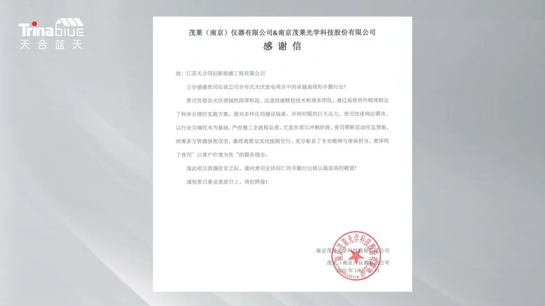 近日,天合藍(lán)天收到南京茂萊光學(xué)科技股份有限公司(以下簡(jiǎn)稱“茂萊光學(xué)”)發(fā)來的感謝信,對(duì)天合藍(lán)天在其1.54MW原裝光伏項(xiàng)目建設(shè)中展現(xiàn)的專業(yè)能力與高效執(zhí)行給予了高度評(píng)價(jià)。據(jù)悉,該項(xiàng)目已成功并網(wǎng)并穩(wěn)定運(yùn)行三個(gè)月,成為茂萊光學(xué)推進(jìn)綠色制造、實(shí)現(xiàn)“雙碳”目標(biāo)的重要舉措。
