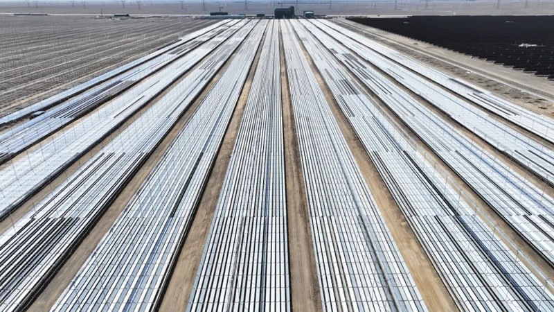 工人正在調(diào)試設(shè)備 在項目建設(shè)過程中,建設(shè)單位充分發(fā)揮全產(chǎn)業(yè)鏈優(yōu)勢,整合各方資源,攻克了多項技術(shù)難題。特別是在光熱發(fā)電領(lǐng)域,采用先進的熔鹽儲熱技術(shù),儲熱時長達到12小時以上,這一技術(shù)的應(yīng)用確保了夜間和陰雨天氣等不利條件下也能實現(xiàn)持續(xù)電力輸出,極大地提升了項目供電的可靠性。光伏部分則選用了轉(zhuǎn)換效率超過22%的高效組件,配合智能跟蹤系統(tǒng),能夠根據(jù)光照情況自動調(diào)整角度,大幅提升了發(fā)電效率。 魏澤鵬介紹,項目建成后有利于進一步研究探索太陽能熱發(fā)電技術(shù),為我國在該領(lǐng)域積累寶貴的項目建設(shè)經(jīng)驗,能夠促進反射鏡、集熱管、儲能系統(tǒng)等關(guān)鍵設(shè)備和部件的國產(chǎn)化進程,推動相關(guān)產(chǎn)業(yè)的技術(shù)進步,對促進太陽能熱發(fā)電產(chǎn)業(yè)健康有序發(fā)展起到重要的示范作用。 項目投運后,平均年發(fā)電量將達22.1億千瓦時,每年可節(jié)約標(biāo)準(zhǔn)煤66.4萬噸,減少二氧化碳排放量172.7萬噸。