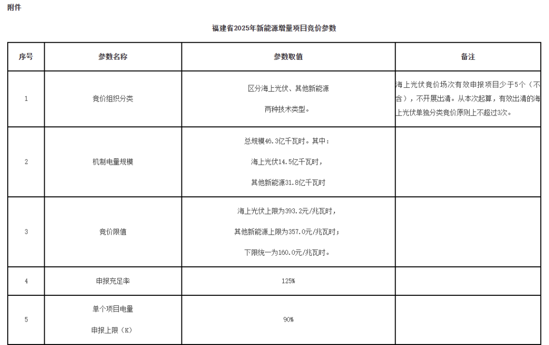 11月7日,福建省發(fā)展和改革委員會 國家能源局福建監(jiān)管辦公室發(fā)布《關(guān)于福建省2025年新能源增量項目競價有關(guān)事項的通知》。 文件明確,競價主體項目要求2025年6月1日(含)至2026年12月31日(含)期間已全容量并網(wǎng)投產(chǎn)或計劃全容量并網(wǎng)投產(chǎn)、且未納入過機(jī)制執(zhí)行范圍,不包括2025年1月27日(不含)前競爭性配置的海上風(fēng)電項目。分布式新能源項目可以委托競價代理商參與競價。 競價組織分類區(qū)分海上光伏、其他新能源兩種技術(shù)類型。海上光伏競價場次有效申報項目少于5個(不含),不開展出清。從本次起算,有效出清的海上光伏單獨分類競價原則上不超過3次。 機(jī)制電量總規(guī)模46.3億千瓦時。其中,海上光伏14.5億千瓦時,其他新能源31.8億千瓦時。 申報充足率125%,單個項目電量申報上限為90%,執(zhí)行期限12年。 競價上下限:海上光伏上限為393.2元/兆瓦時,其他新能源上限為357.0元/兆瓦時;下限統(tǒng)一為160.0元/兆瓦時。 原文件如下: 福建省發(fā)展和改革委員會 國家能源局福建監(jiān)管辦公室 關(guān)于福建省2025年新能源增量項目競價有關(guān)事項的通知 各設(shè)區(qū)市發(fā)改委、平潭綜合實驗區(qū)市場監(jiān)管局,國網(wǎng)福建省電力有限公司、福建電力交易中心有限公司: 根據(jù)《福建省深化新能源上網(wǎng)電價市場化改革 促進(jìn)新能源高質(zhì)量發(fā)展實施方案》(閩發(fā)改規(guī)〔2025〕9號)等規(guī)定,決定開展2025年新能源增量項目競價,有關(guān)事項通知如下。 競價主體為具有獨立承擔(dān)民事責(zé)任能力和獨立簽訂合同權(quán)利的法人或自然人,其項目應(yīng)于2025年6月1日(含)至2026年12月31日(含)期間已全容量并網(wǎng)投產(chǎn)或計劃全容量并網(wǎng)投產(chǎn)、且未納入過機(jī)制執(zhí)行范圍,不包括2025年1月27日(不含)前競爭性配置的海上風(fēng)電項目。分布式新能源項目可以委托競價代理商參與競價。競價參數(shù)詳見附件。 本通知印發(fā)后,國網(wǎng)福建省電力有限公司應(yīng)及時發(fā)布競價公告,明確競價流程、時間安排等具體事項。競價最終結(jié)果由省發(fā)改委會同福建能源監(jiān)管辦另行公布。 本通知未盡事宜,按照閩發(fā)改規(guī)〔2025〕9號文件等規(guī)定執(zhí)行。 競價監(jiān)督郵箱:shtxxllbf@sina.com 附件:福建省2025年新能源增量項目競價參數(shù) 福建省發(fā)展和改革委員會 國家能源局福建監(jiān)管辦公室 2025年11月7日 (此件主動公開)