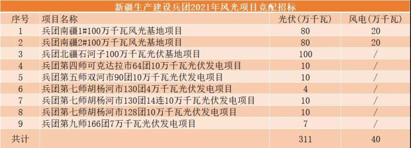 新疆生產(chǎn)建設(shè)兵團(tuán)發(fā)布2021年風(fēng)電、光伏發(fā)電項(xiàng)目競(jìng)配招標(biāo)公告。此次招標(biāo)總規(guī)模351萬(wàn)千瓦,共分為9個(gè)標(biāo)段。其中光伏311萬(wàn)千瓦,風(fēng)電40萬(wàn)千瓦。具體項(xiàng)目如下: 根據(jù)招標(biāo)公告,各標(biāo)段項(xiàng)目又進(jìn)一步劃分了建設(shè)地點(diǎn)與規(guī)模。標(biāo)段1建設(shè)地點(diǎn)與規(guī)模:一師10團(tuán)轄區(qū)40萬(wàn)千瓦光伏、三師45團(tuán)轄區(qū)40萬(wàn)千瓦光伏、二師36團(tuán)轄區(qū)20萬(wàn)千瓦風(fēng)電,合計(jì)100萬(wàn)千瓦。 標(biāo)段2:十四師昆玉轄區(qū)40萬(wàn)千瓦光伏、二師33團(tuán)轄區(qū)20萬(wàn)千瓦光伏、二師34團(tuán)轄區(qū)20萬(wàn)千瓦光伏、二師36團(tuán)轄區(qū)20萬(wàn)千瓦風(fēng)電,合計(jì)100萬(wàn)千瓦。 標(biāo)段3:八師142團(tuán)轄區(qū)60萬(wàn)千瓦光伏、八師134團(tuán)轄區(qū)40萬(wàn)千瓦光伏,合計(jì)100萬(wàn)千瓦。 標(biāo)段4:四師64團(tuán)轄區(qū),10萬(wàn)千瓦。 標(biāo)段5:五師90團(tuán)轄區(qū),10萬(wàn)千瓦。 標(biāo)段6:七師130團(tuán)轄區(qū),4萬(wàn)千瓦。 標(biāo)段7:七師130團(tuán)14連轄區(qū),10萬(wàn)千瓦。 標(biāo)段8:七師128團(tuán)轄區(qū),10萬(wàn)千瓦。 標(biāo)段9:九師166團(tuán)轄區(qū),7萬(wàn)千瓦。 此外,對(duì)于項(xiàng)目建設(shè)進(jìn)度要求:第3,8標(biāo)段,要求2022年12月前項(xiàng)目投資占比不低于項(xiàng)目總投資的50%,2023年12月底前具備全容量并網(wǎng)條件。 其余標(biāo)段,要求2022年6月前項(xiàng)目投資占比不低于項(xiàng)目總投資的30%,2022年12月底前具備全容量并網(wǎng)條件。 在保障項(xiàng)目安全質(zhì)量和生態(tài)環(huán)保的前提下,鼓勵(lì)投標(biāo)人通過(guò)優(yōu)化項(xiàng)目建設(shè)方案縮短項(xiàng)目建設(shè)周期。配套儲(chǔ)能規(guī)模原則上與項(xiàng)目本體同步建設(shè)。 而無(wú)論是單個(gè)體還是聯(lián)合體身份,一個(gè)企業(yè)集團(tuán)(含企業(yè)集團(tuán)最高級(jí)母公司及其下級(jí)公司)只能在本批次競(jìng)爭(zhēng)性配置所有標(biāo)段中的1個(gè)標(biāo)段中標(biāo)。