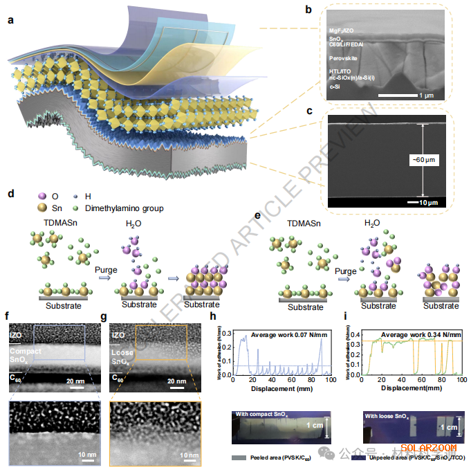 二、研究亮點(diǎn) 首次提出“致密/疏松”雙緩沖SnO?層策略,兼顧電荷提取與應(yīng)力釋放; 小面積(1 cm2)電池認(rèn)證效率達(dá)33.35%,大面積(260 cm2)組件效率達(dá)29.8%,創(chuàng)柔性光伏紀(jì)錄; 功率重量比高達(dá)1.77 W/g,遠(yuǎn)超現(xiàn)有柔性電池; 經(jīng)4.3萬(wàn)次彎曲、250次冷熱循環(huán)后,效率仍保持97%以上,具備極強(qiáng)機(jī)械與環(huán)境穩(wěn)定性。 三、核心機(jī)理 研究團(tuán)隊(duì)通過(guò)調(diào)控原子層沉積過(guò)程中的吹掃時(shí)間,制備出兩種結(jié)構(gòu)迥異的SnO?層: 致密SnO?層(吹掃10秒):具有良好的電荷提取與界面鈍化能力,保障高效率; 疏松SnO?層(吹掃2秒):呈現(xiàn)多孔結(jié)構(gòu),可有效吸收濺射與彎折過(guò)程中的應(yīng)力,防止界面剝離。 雙層協(xié)同作用,既保護(hù)底層鈣鈦礦與C??層,又維持高效電子傳輸路徑。 四、機(jī)理驗(yàn)證與對(duì)比實(shí)驗(yàn) 剝離實(shí)驗(yàn)顯示,疏松SnO?層樣品的粘附功比致密層高5倍; 微觀應(yīng)變分析證實(shí),疏松層顯著降低鈣鈦礦薄膜的內(nèi)應(yīng)力; 光致發(fā)光成像表明,雙緩沖層器件在彎曲后仍保持均勻發(fā)光,無(wú)界面退化; 認(rèn)證效率經(jīng)NREL與Fraunhofer ISE雙重驗(yàn)證,效率與穩(wěn)定性均達(dá)行業(yè)頂尖水平。 五、總結(jié)與展望 本研究不僅突破了柔性疊層太陽(yáng)能電池的效率與耐久性瓶頸,更展示了一種通用性強(qiáng)的界面應(yīng)力管理策略,適用于多種柔性光電器件。未來(lái),該技術(shù)有望推動(dòng): 可穿戴電子設(shè)備的自供電系統(tǒng); 輕型化、可卷曲的光伏發(fā)電產(chǎn)品; 建筑表面一體化柔性光伏組件。 這項(xiàng)成果標(biāo)志著柔性光伏技術(shù)正式步入“高效率+高可靠”并重的新階段。
