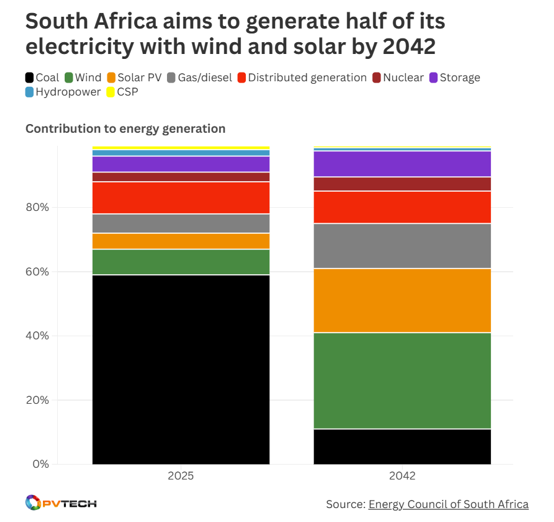 昨日,南非電力與能源部長科西恩特肖·拉莫克戈帕博士(Dr Kgosientsho Ramokgopa)向電力與能源事務(wù)組合委員會提交了最新《綜合資源計劃》(IRP)。圖片來源:南非政府(通過Flickr發(fā)布)。 下圖展示了2026-2030年及2031-2042年兩個階段各技術(shù)路線的新增裝機(jī)目標(biāo)。盡管太陽能光伏新增裝機(jī)容量預(yù)計將從10.3GW增至18.4GW,近乎翻倍,但最顯著的變化將出現(xiàn)在風(fēng)電領(lǐng)域——政府計劃到2042年新增35.7GW風(fēng)電裝機(jī),規(guī)模幾乎是2026-2030年期間新增裝機(jī)的五倍。 拉莫克戈帕在演示材料中指出:“《綜合資源計劃》(IRP)的核心在于通過供需平衡保障電力供應(yīng)安全,同時優(yōu)化環(huán)境影響與供電總成本。”這表明,對于飽受電網(wǎng)脆弱性困擾、頻繁遭遇停電的南非而言,保障能源安全是首要任務(wù)。 盡管第六輪可再生能源獨立電力生產(chǎn)商計劃(REIPPP)已授予860MW太陽能裝機(jī)容量,但因電網(wǎng)容量受限,實際授予規(guī)模遠(yuǎn)低于4.2GW的預(yù)期目標(biāo);受電網(wǎng)制約,申請審批的3.2GW風(fēng)電裝機(jī)容量更是無一中標(biāo)。 不過,電池儲能系統(tǒng)(BESS)的部署增速預(yù)計將低于太陽能和風(fēng)電:2026-2030年期間預(yù)計新增3.7GW裝機(jī)容量,2031-2042年期間預(yù)計新增5.8GW。這表明電池儲能系統(tǒng)不會成為強(qiáng)化電網(wǎng)穩(wěn)定性的關(guān)鍵要素。 太陽能光伏與風(fēng)電將主導(dǎo)電力供應(yīng) 事實上,如下方圖表所示,到2042年儲能裝機(jī)容量在南非能源結(jié)構(gòu)中的占比將僅略高于8%。對太陽能光伏和風(fēng)電的投資預(yù)期,以及對新建煤電項目的支持缺失,將推動南非能源結(jié)構(gòu)向可再生能源大幅轉(zhuǎn)型——屆時太陽能光伏、風(fēng)電與水電的發(fā)電量占比將超過電力總供應(yīng)量的一半。