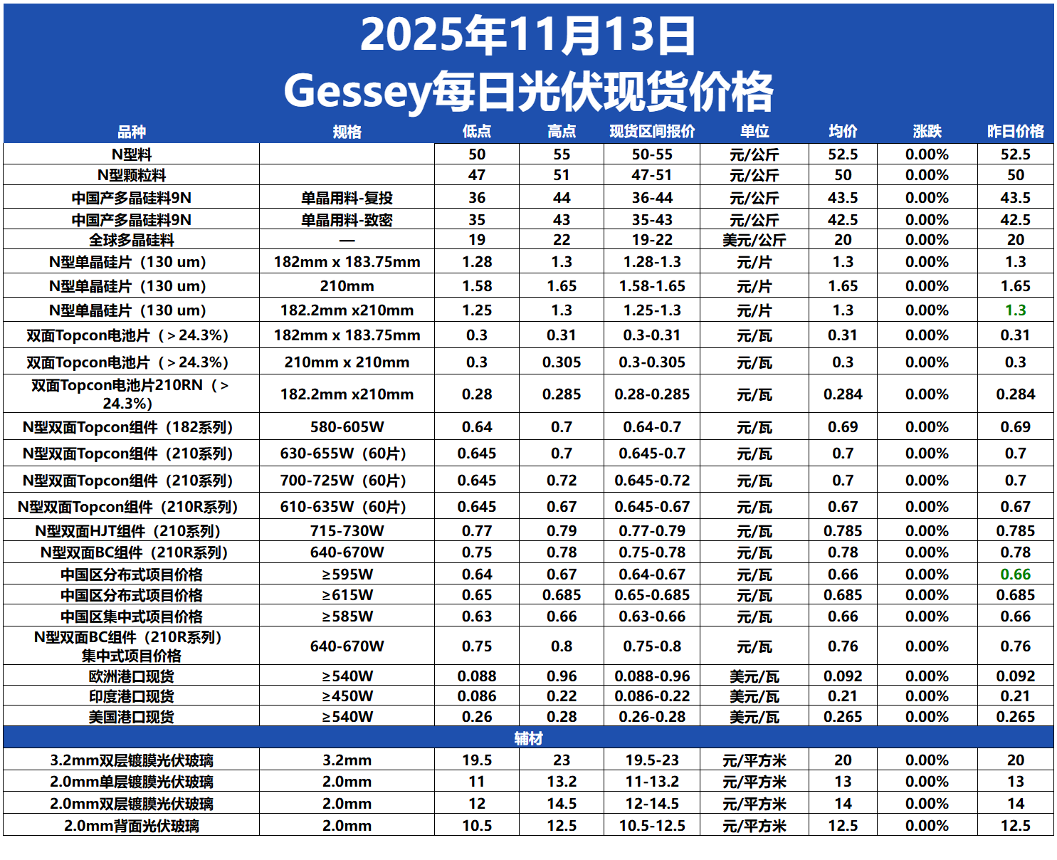 Gessey:11月13日每日光伏市場(chǎng)行情2025-11-13 18:48來(lái)源:gessey瀏覽數(shù):249次