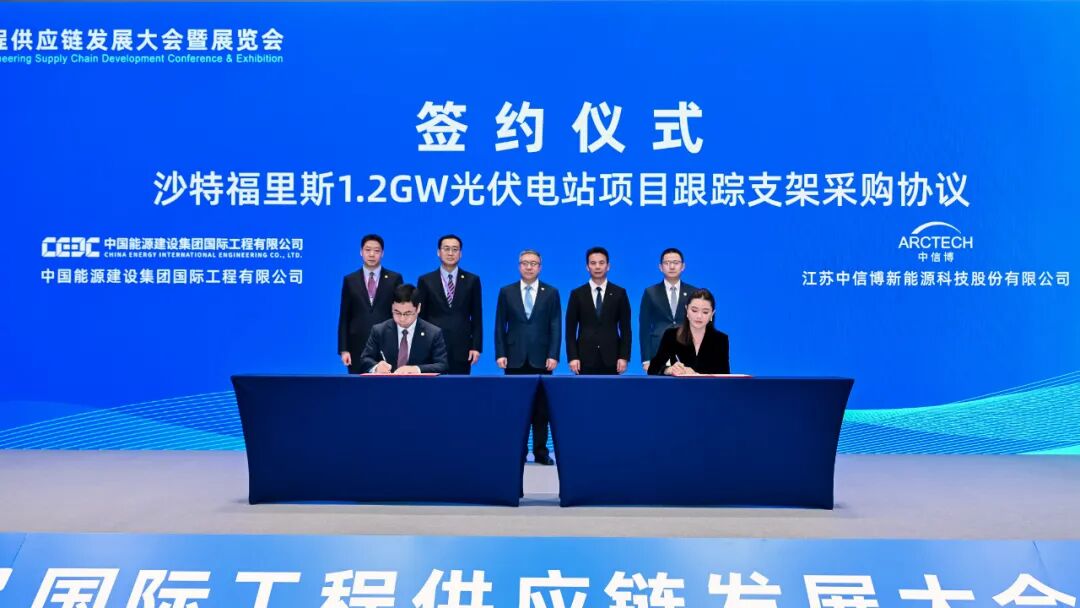近日,在2025國際工程供應(yīng)鏈發(fā)展大會上,中信博與中國能源建設(shè)集團國際工程有限公司簽署沙特PIF6福里斯1.2GW光伏項目跟蹤支架合作協(xié)議。中國能源建設(shè)集團國際工程有限公司副總經(jīng)理龔謙、中信博中國區(qū)總裁郭菲代表雙方簽署合作協(xié)議,中國對外承包商會會長房秋晨,中國能源建設(shè)股份有限公司黨委委員、海外運營總監(jiān)呂澤翔,中國能建國際建設(shè)集團有限公司副總裁葉暉,中信博董事、高級副總裁周石俊等現(xiàn)場見證簽約。