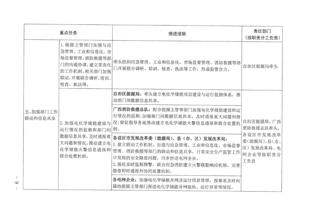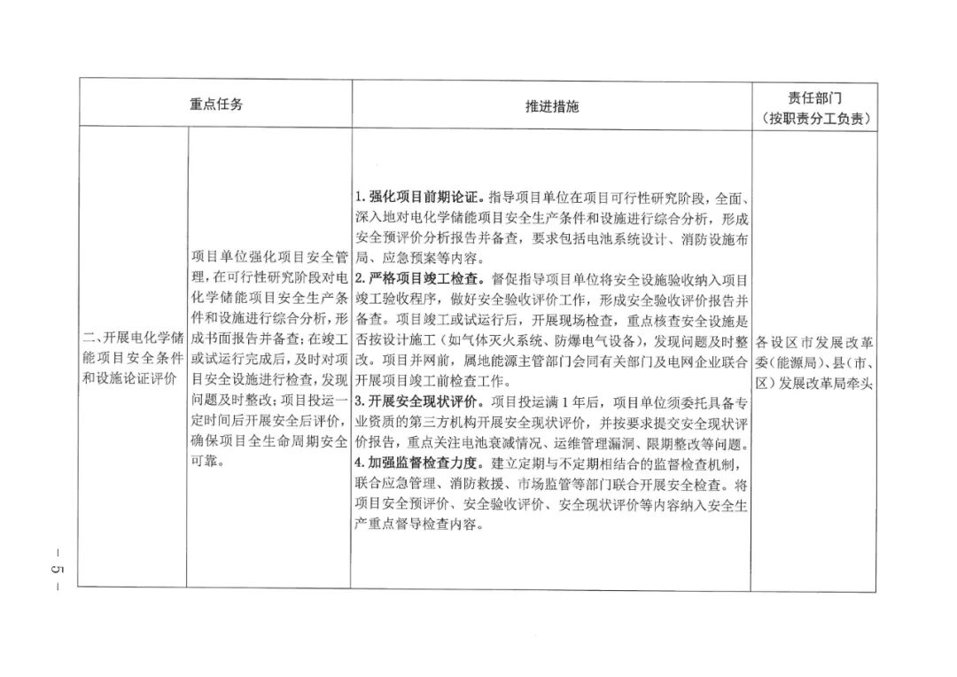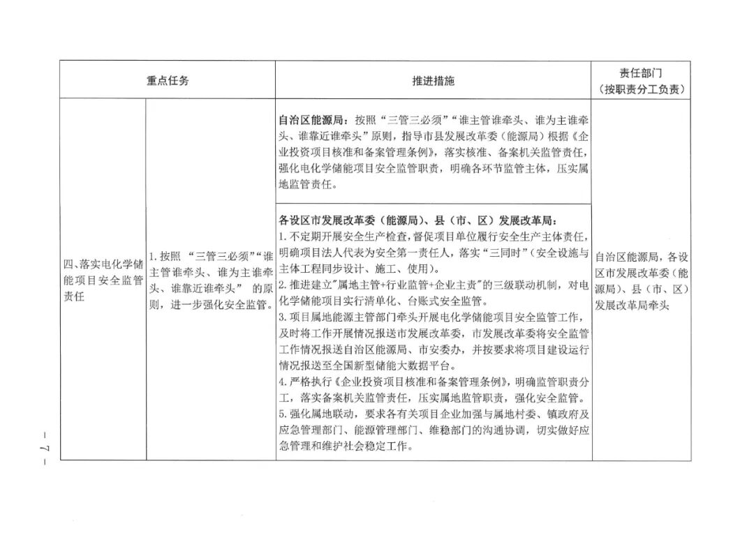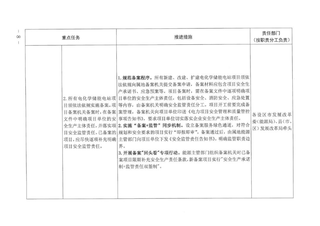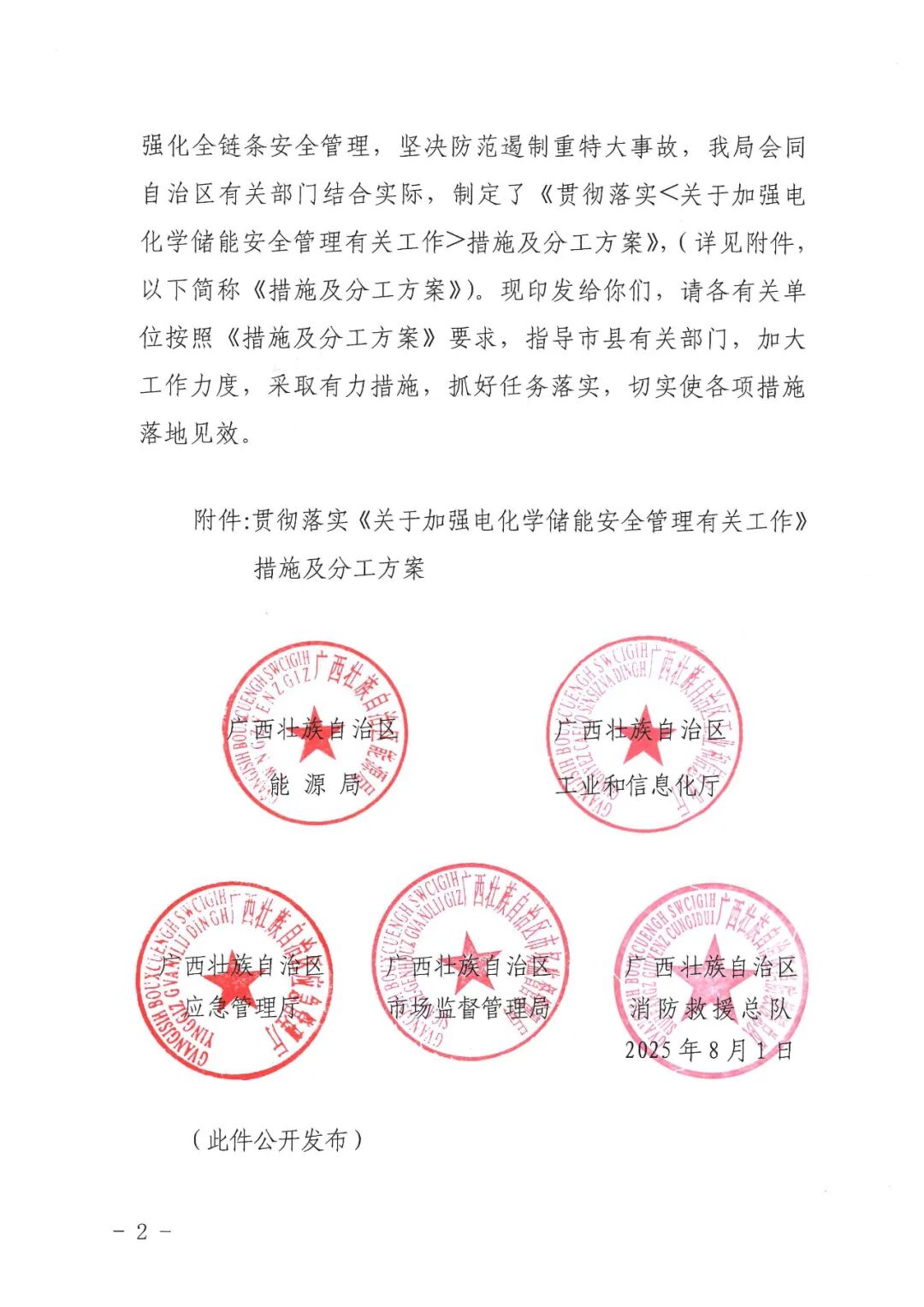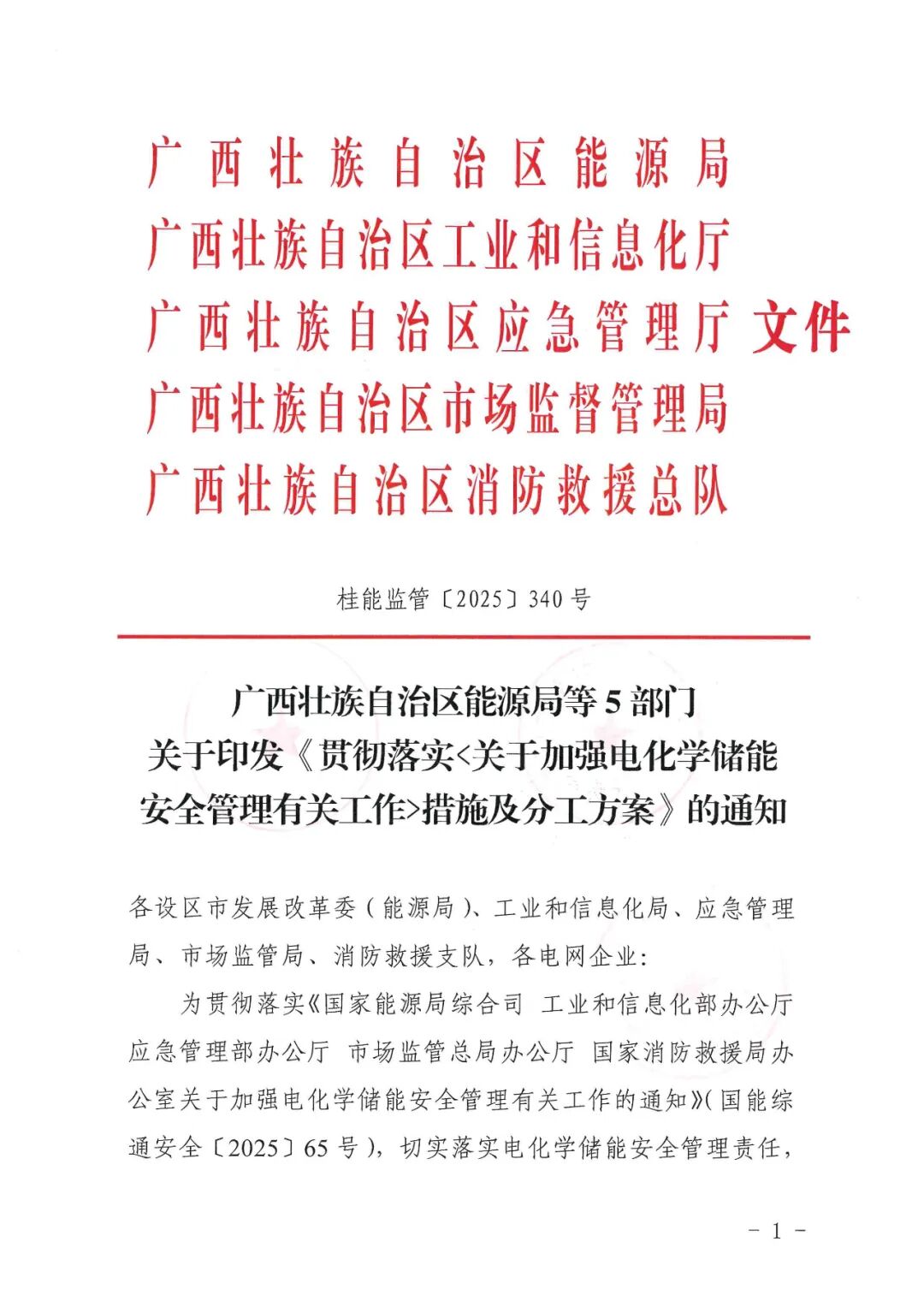 柳發(fā)改能安〔2025〕23號(hào)柳州市發(fā)展和改革委員會(huì)關(guān)于進(jìn)一步貫徹落實(shí)電化學(xué)儲(chǔ)能安全管理有關(guān)工作的通知 各縣(區(qū))、新區(qū)發(fā)展改革部門,柳州供電局,各相關(guān)能源企業(yè): 為貫徹落實(shí)《國(guó)家能源局綜合司 工業(yè)和信息化部辦公廳 應(yīng)急管理部辦公廳 市場(chǎng)監(jiān)管總局辦公廳 國(guó)家消防救援局辦公室關(guān)于加強(qiáng)電化學(xué)儲(chǔ)能安全管理有關(guān)工作的通知》(國(guó)能綜通安全〔2025〕65號(hào))及《廣西壯族自治區(qū)能源局等5部門關(guān)于印發(fā)貫徹落實(shí)關(guān)于加強(qiáng)電化學(xué)儲(chǔ)能安全管理有關(guān)工作措施及分工方案的通知》(桂能監(jiān)管〔2025〕340號(hào))精神,切實(shí)提升我市電化學(xué)儲(chǔ)能安全管理水平,現(xiàn)就進(jìn)一步強(qiáng)化電化學(xué)儲(chǔ)能安全管理工作通知如下: 一、強(qiáng)化電化學(xué)儲(chǔ)能項(xiàng)目安全條件和設(shè)施論證評(píng)價(jià) (一)加強(qiáng)項(xiàng)目前期安全論證。項(xiàng)目單位應(yīng)在可行性研究階段,對(duì)電化學(xué)儲(chǔ)能項(xiàng)目的安全生產(chǎn)條件及設(shè)施開展全面、深入的綜合分析,編制安全預(yù)評(píng)價(jià)分析報(bào)告,內(nèi)容應(yīng)包括但不限于電池選型與系統(tǒng)設(shè)計(jì)、消防設(shè)施配置與布局、應(yīng)急預(yù)案與應(yīng)急處置流程等,并留存?zhèn)洳椤?/p> (二)嚴(yán)格項(xiàng)目竣工安全驗(yàn)收。項(xiàng)目單位應(yīng)將安全設(shè)施驗(yàn)收納入項(xiàng)目整體竣工驗(yàn)收范疇,做好安全驗(yàn)收評(píng)價(jià)工作,形成安全驗(yàn)收評(píng)價(jià)報(bào)告并歸檔備查。項(xiàng)目竣工或試運(yùn)行后,項(xiàng)目單位應(yīng)重點(diǎn)核查安全設(shè)施是否按設(shè)計(jì)施工(如氣體滅火系統(tǒng)、防爆電氣設(shè)備等),發(fā)現(xiàn)問(wèn)題及時(shí)整改。項(xiàng)目并網(wǎng)前,由屬地發(fā)展改革部門會(huì)同有關(guān)部門及電網(wǎng)企業(yè)聯(lián)合開展項(xiàng)目竣工前檢查工作。 (三)定期開展安全現(xiàn)狀評(píng)價(jià)。項(xiàng)目投運(yùn)滿一年后,項(xiàng)目單位須委托具備相應(yīng)專業(yè)資質(zhì)的第三方機(jī)構(gòu)開展安全現(xiàn)狀評(píng)價(jià),全面排查電池健康狀態(tài)、系統(tǒng)運(yùn)行效能及運(yùn)維管理體系,識(shí)別潛在隱患并落實(shí)整改,評(píng)價(jià)報(bào)告應(yīng)及時(shí)報(bào)送屬地發(fā)展改革部門備案。 (四)建立健全監(jiān)督檢查機(jī)制。各縣(區(qū))、新區(qū)發(fā)展改革部門應(yīng)聯(lián)合應(yīng)急管理、消防救援、市場(chǎng)監(jiān)管等部門,采取定期與不定期相結(jié)合的方式,將項(xiàng)目安全預(yù)評(píng)價(jià)、安全驗(yàn)收評(píng)價(jià)、安全現(xiàn)狀評(píng)價(jià)等內(nèi)容納入安全生產(chǎn)重點(diǎn)督導(dǎo)檢查內(nèi)容。 二、壓實(shí)電化學(xué)儲(chǔ)能項(xiàng)目安全監(jiān)管責(zé)任 (一)明確監(jiān)管職責(zé)分工。嚴(yán)格按照“三管三必須”和“誰(shuí)主管誰(shuí)牽頭、誰(shuí)為主誰(shuí)牽頭、誰(shuí)靠近誰(shuí)牽頭”原則,進(jìn)一步厘清并壓實(shí)電化學(xué)儲(chǔ)能項(xiàng)目安全監(jiān)管責(zé)任,各縣(區(qū))、新區(qū)發(fā)展改革部門應(yīng)切實(shí)履行屬地監(jiān)管職責(zé),督促項(xiàng)目單位全面落實(shí)安全生產(chǎn)主體責(zé)任,明確項(xiàng)目法定代表人或?qū)嶋H控制人為安全生產(chǎn)第一責(zé)任人,嚴(yán)格執(zhí)行安全設(shè)施“三同時(shí)”(安全設(shè)施與主體工程同步設(shè)計(jì)、施工、使用)管理要求。 (二)規(guī)范項(xiàng)目備案管理。所有新建、改建、擴(kuò)建電化學(xué)儲(chǔ)能電站項(xiàng)目須依法依規(guī)向?qū)俚匕l(fā)展改革部門提交備案申請(qǐng),備案材料應(yīng)包含項(xiàng)目安全生產(chǎn)承諾書、應(yīng)急預(yù)案等。項(xiàng)目備案時(shí),需在備案文件中逐項(xiàng)明確項(xiàng)目單位的安全生產(chǎn)主體責(zé)任,包括設(shè)備安全、消防安全、應(yīng)急處置等內(nèi)容。對(duì)已備案項(xiàng)目,應(yīng)組織開展備案“回頭看”,限期補(bǔ)充完善安全生產(chǎn)責(zé)任條款。 (三)實(shí)施備案與監(jiān)管聯(lián)動(dòng)。設(shè)立電化學(xué)儲(chǔ)能項(xiàng)目備案綠色通道,對(duì)符合條件的項(xiàng)目實(shí)行“即報(bào)即審”。備案通過(guò)后,由屬地發(fā)展改革部門向項(xiàng)目單位下達(dá)《安全監(jiān)管責(zé)任告知書》、《電力項(xiàng)目安全管理和質(zhì)量管控事項(xiàng)告知書》,明確監(jiān)管主體及責(zé)任邊界。 (四)強(qiáng)化屬地協(xié)同監(jiān)管。推動(dòng)建立“屬地主管+行業(yè)監(jiān)管+企業(yè)主責(zé)”三級(jí)聯(lián)動(dòng)機(jī)制,對(duì)電化學(xué)儲(chǔ)能項(xiàng)目實(shí)行清單化、臺(tái)賬式管理。項(xiàng)目單位應(yīng)主動(dòng)加強(qiáng)與屬地村鎮(zhèn)、應(yīng)急管理、發(fā)展改革及社會(huì)穩(wěn)定相關(guān)部門的溝通協(xié)調(diào),共同做好應(yīng)急準(zhǔn)備與社會(huì)風(fēng)險(xiǎn)防控工作。 三、加強(qiáng)部門聯(lián)動(dòng)和信息共享 (