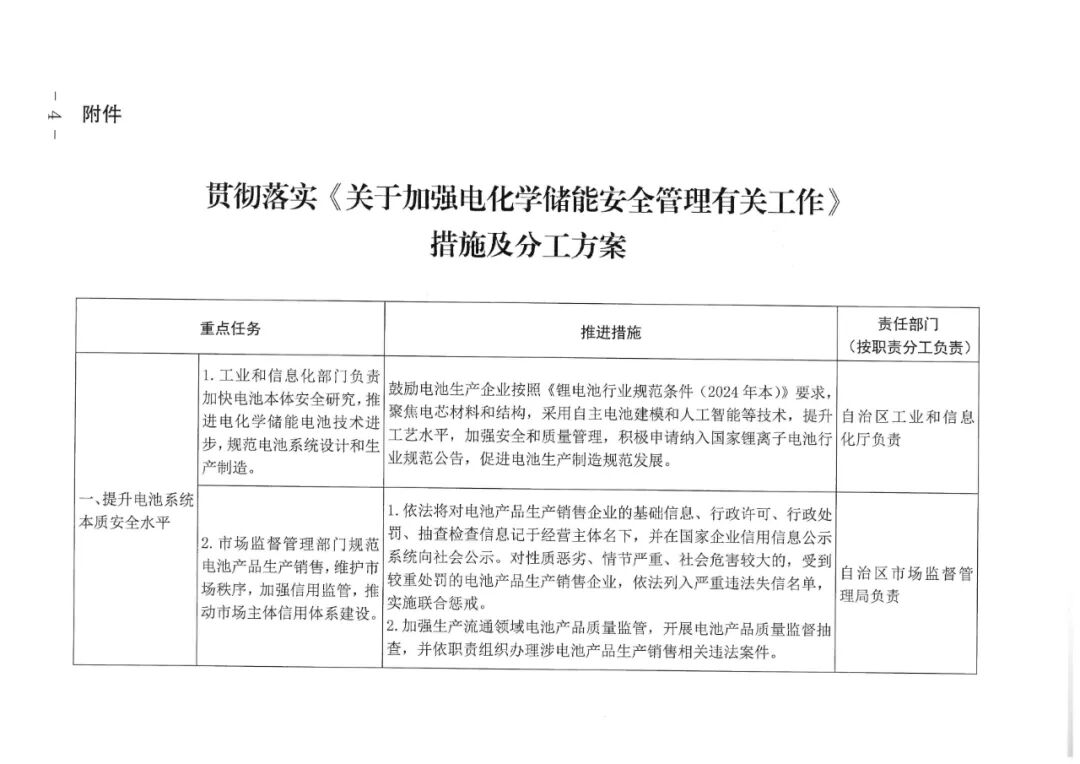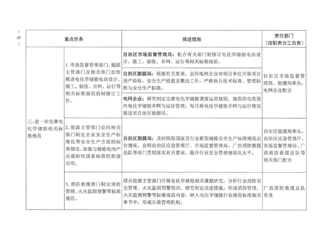 2025年11月18日,柳州市發(fā)改委轉(zhuǎn)發(fā)廣西發(fā)改委印發(fā)的《關(guān)于印發(fā)貫徹落實(shí)關(guān)于加強(qiáng)電化學(xué)儲(chǔ)能安全管理有關(guān)工作措施及分工方案的通知》。文件提到:項(xiàng)目投運(yùn)滿1年后,項(xiàng)目單位須委托具備專業(yè)資質(zhì)的第三方機(jī)構(gòu)開展安全現(xiàn)狀評(píng)價(jià),并按要求提交安全現(xiàn)狀評(píng)價(jià)報(bào)告,重點(diǎn)關(guān)注電池衰減情況、運(yùn)維管理漏洞、限期整改等問(wèn)題。 指導(dǎo)項(xiàng)目單位在項(xiàng)目可行性研究階段,全面、深入地對(duì)電化學(xué)儲(chǔ)能項(xiàng)目安全生產(chǎn)條件和設(shè)施進(jìn)行綜合分析,形成安全預(yù)評(píng)價(jià)分析報(bào)告并備查,要求包括電池系統(tǒng)設(shè)計(jì)、消防設(shè)施布局、應(yīng)急預(yù)案等內(nèi)容。 項(xiàng)目竣工或試運(yùn)行后,開展現(xiàn)場(chǎng)檢查,重點(diǎn)核查安全設(shè)施是否按設(shè)計(jì)施工(如氣體滅火系統(tǒng)、防爆電氣設(shè)備),發(fā)現(xiàn)問(wèn)題及時(shí)整改。 項(xiàng)目單位應(yīng)對(duì)電化學(xué)儲(chǔ)能項(xiàng)目規(guī)劃、設(shè)計(jì)、建設(shè)、運(yùn)營(yíng)及退役各環(huán)節(jié)實(shí)施全面安全管理,確保安全設(shè)施與主體工程同時(shí)設(shè)計(jì)、同時(shí)施工、同時(shí)投產(chǎn)使用。 原文如下: