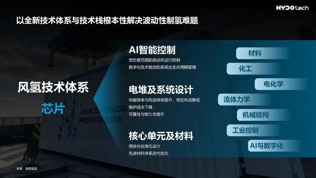 在全球首個(gè)商業(yè)化綠甲醇項(xiàng)目中,海德氫能推出面向大規(guī)模風(fēng)電制氫的HydoLyser? X制氫系統(tǒng)及車間級(jí)解決方案HydoPlant。面向風(fēng)電波動(dòng)性制氫場(chǎng)景,海德氫能以全新技術(shù)體系,以核心單元及材料、電堆結(jié)構(gòu)設(shè)計(jì)、AI智能系統(tǒng)等領(lǐng)域的技術(shù)創(chuàng)新,根本性解決波動(dòng)性制氫難題。歷時(shí)三年,20000+小時(shí)驗(yàn)證,超億元投資,海德氫能全新HydoLyser? X制氫系統(tǒng)實(shí)現(xiàn)優(yōu)異的性能表現(xiàn):全工況電耗低于4.3kWh/Nm3,實(shí)現(xiàn)了10%-120%寬負(fù)荷運(yùn)行(全工況氧中氫含量低于0.3%),且電流效率超過97%。