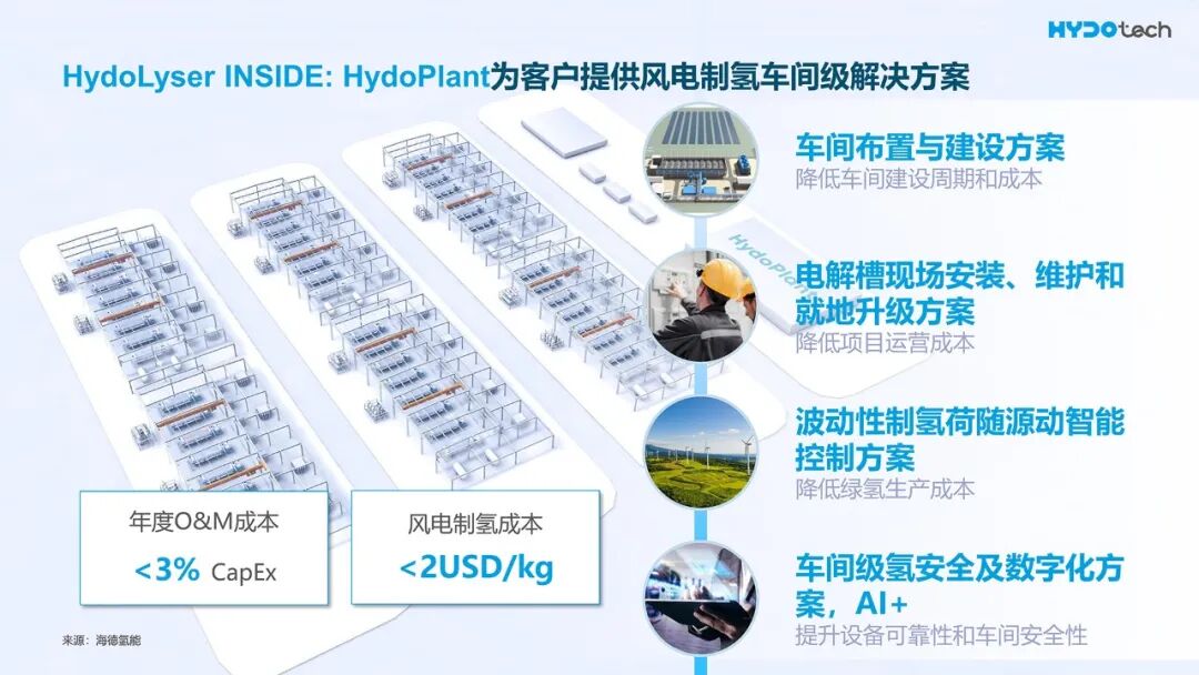 HydoPlant集成了車間布置建設(shè)方案、現(xiàn)場(chǎng)安裝維護(hù)升級(jí)方案、波動(dòng)性制氫智能控制系統(tǒng),以及車間級(jí)氫安全與數(shù)字化體系,打造了新能源集成與制氫運(yùn)營的一體化工程基礎(chǔ)。結(jié)合HydoOS智能管理系統(tǒng)與HydoLyser插片式運(yùn)維技術(shù),年度O&M成本低于3%的CapEx投入。