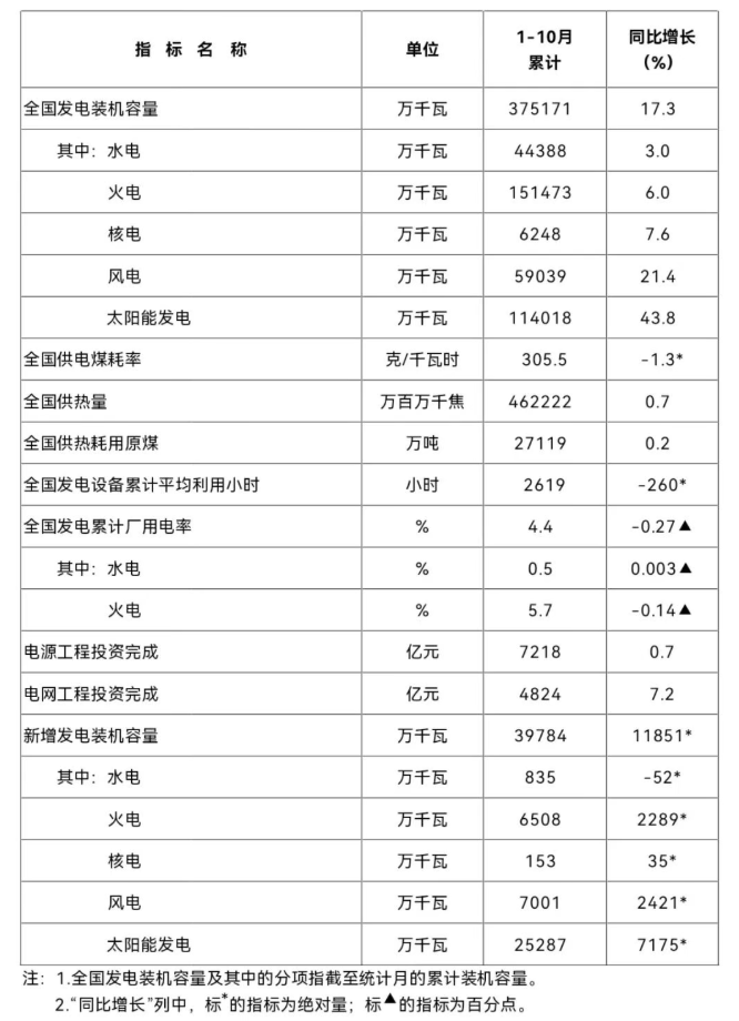 11月24日,國家能源局發(fā)布2025年1-10月份全國電力工業(yè)統(tǒng)計(jì)數(shù)據(jù)。 截至10月底,全國累計(jì)發(fā)電裝機(jī)容量37.5億千瓦,同比增長17.3%。其中,太陽能發(fā)電裝機(jī)容量11.4億千瓦,同比增長43.8%;風(fēng)電裝機(jī)容量5.9億千瓦,同比增長21.4%。1-10月份,全國發(fā)電設(shè)備累計(jì)平均利用2619小時(shí),比上年同期降低260小時(shí)。 1~10月,太陽能發(fā)電累計(jì)規(guī)模為25287萬千瓦,10月新增裝機(jī)規(guī)模為1260萬千瓦,環(huán)比增長30.43%。 全國電力工業(yè)統(tǒng)計(jì)數(shù)據(jù)一覽表 (截至2025年10月)