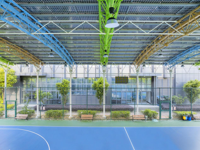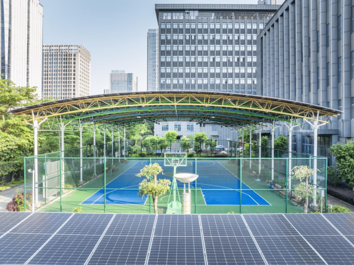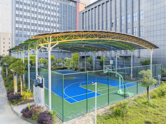 永福綠能“光能球場”的創(chuàng)新基因,體現(xiàn)在設(shè)計(jì)、建造與性能的每一個(gè)維度,實(shí)現(xiàn)了美學(xué)價(jià)值與實(shí)用功能的完美統(tǒng)一。 電站設(shè)計(jì)方面,球場采用行業(yè)首創(chuàng)三維曲線造型管桁架結(jié)構(gòu),弧形穹頂經(jīng)過精準(zhǔn)計(jì)算與拼裝,從遠(yuǎn)處望去如彩虹橫跨園區(qū),既傳遞著陽光活力的體育精神,又以現(xiàn)代感十足的外觀成為企業(yè)園區(qū)的標(biāo)志性景觀。這種將工業(yè)美學(xué)與運(yùn)動(dòng)場景結(jié)合的設(shè)計(jì),打破了傳統(tǒng)運(yùn)動(dòng)場地的刻板印象。