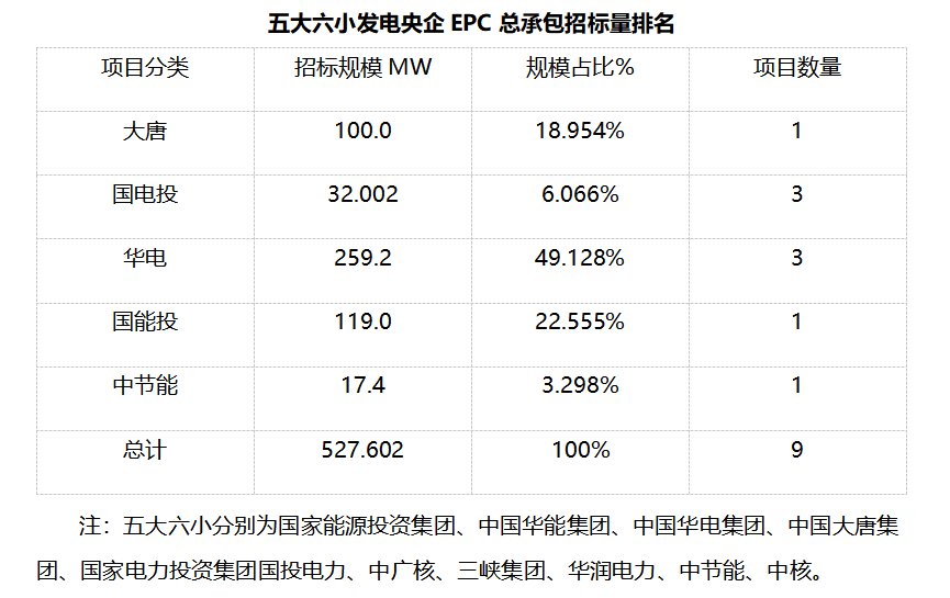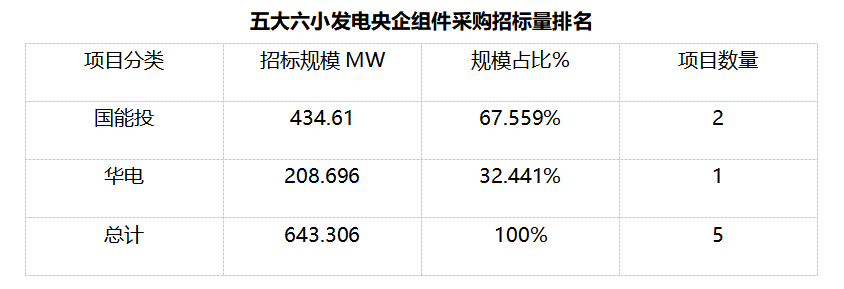 我們統(tǒng)計包含大型央企國企、地方能源集團(tuán)、地方政府機關(guān)、兩大電網(wǎng)、央企總包企業(yè)、知名光伏企業(yè)等,其中五大六小發(fā)電央企占總招標(biāo)規(guī)模較高,具體各企業(yè)排名如下表: