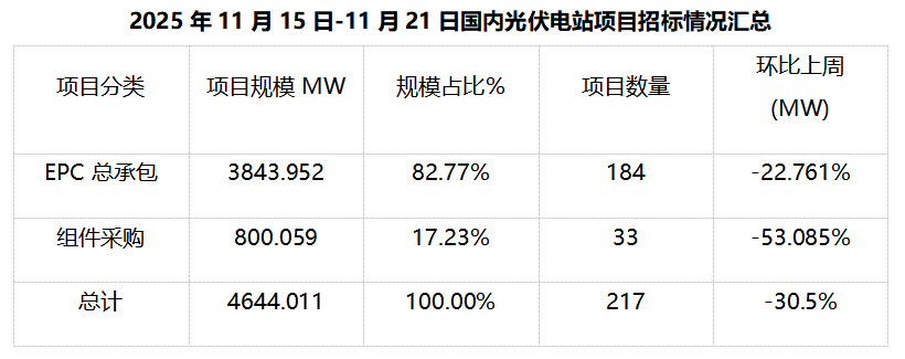 一、光伏項目招標(biāo)情況匯總: 根據(jù)Gessey蓋錫咨詢統(tǒng)計,2025年11月15日-11月21日累計光伏招標(biāo)項目為217個,項目規(guī)模合計為4644.011MW。光伏組件采購招標(biāo)項目為33個,招標(biāo)規(guī)模為800.059MW,環(huán)比上周-53.085%。EPC總承包招標(biāo)項目為184個,招標(biāo)規(guī)模為3843.952MW,環(huán)比上周-22.761%。