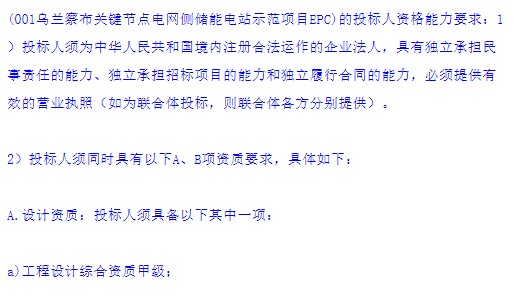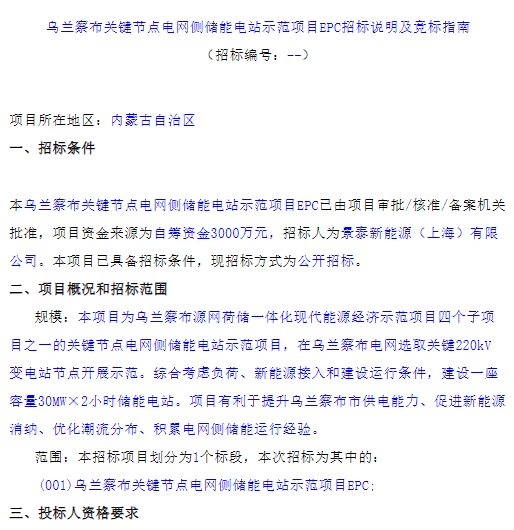 景泰新能源(上海)有限公司發(fā)布烏蘭察布關(guān)鍵節(jié)點(diǎn)電網(wǎng)側(cè)儲(chǔ)能電站示范項(xiàng)目EPC招標(biāo)公告,公告中顯示建設(shè)30MW/60MWh儲(chǔ)能電站,投資金額3000萬(wàn),且要求投標(biāo)人具備5年(2016年至今)至少具有兩個(gè)以上與本項(xiàng)目規(guī)模類似的儲(chǔ)能電站EPC總承包項(xiàng)目業(yè)績(jī)。