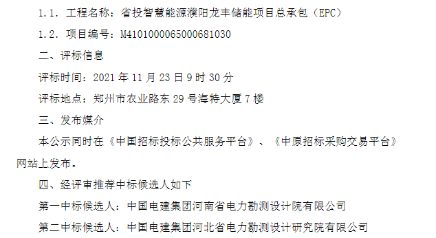 河南省投智慧能源有限公司發(fā)布濮陽龍豐儲能項目EPC中標候選人結(jié)果公示,中國電建集團河南省電力勘測設(shè)計院有限公司為第一候選人,中國電建集團河南省電力勘測設(shè)計研究院有限公司為第二候選人。