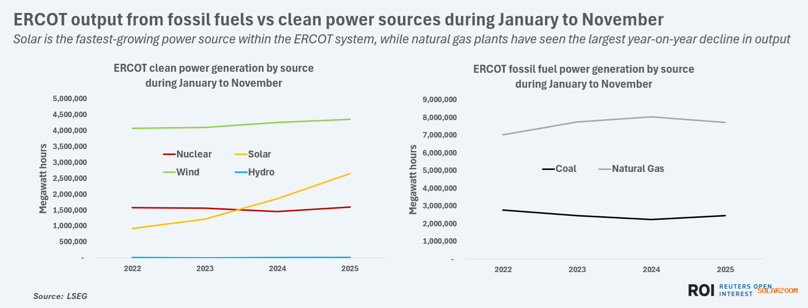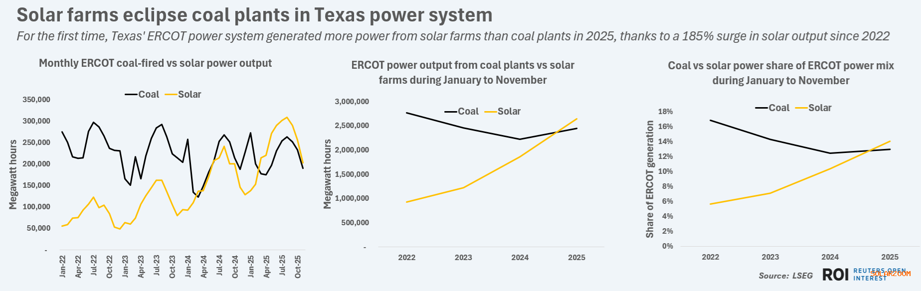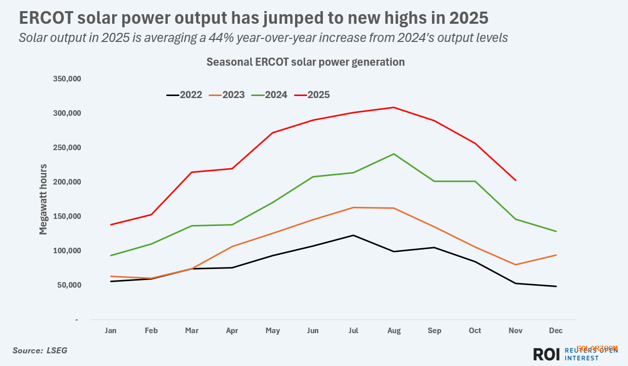 12月9日, 德克薩斯州的主要電力系統(tǒng)首次有望在2025年的一個日歷年內(nèi)從太陽能電站產(chǎn)生比燃煤電廠更多的電力,這標志著美國最大電網(wǎng)在能源轉(zhuǎn)型方面邁出了重要一步。 根據(jù)美國電力公司(LSEG)匯編的數(shù)據(jù),德克薩斯州電力可靠性委員會(ERCOT)從太陽能資產(chǎn)中發(fā)電,發(fā)電時間為264萬兆瓦時(MWh),而1月至11月期間,燃煤電廠的發(fā)電量為244萬兆瓦時。