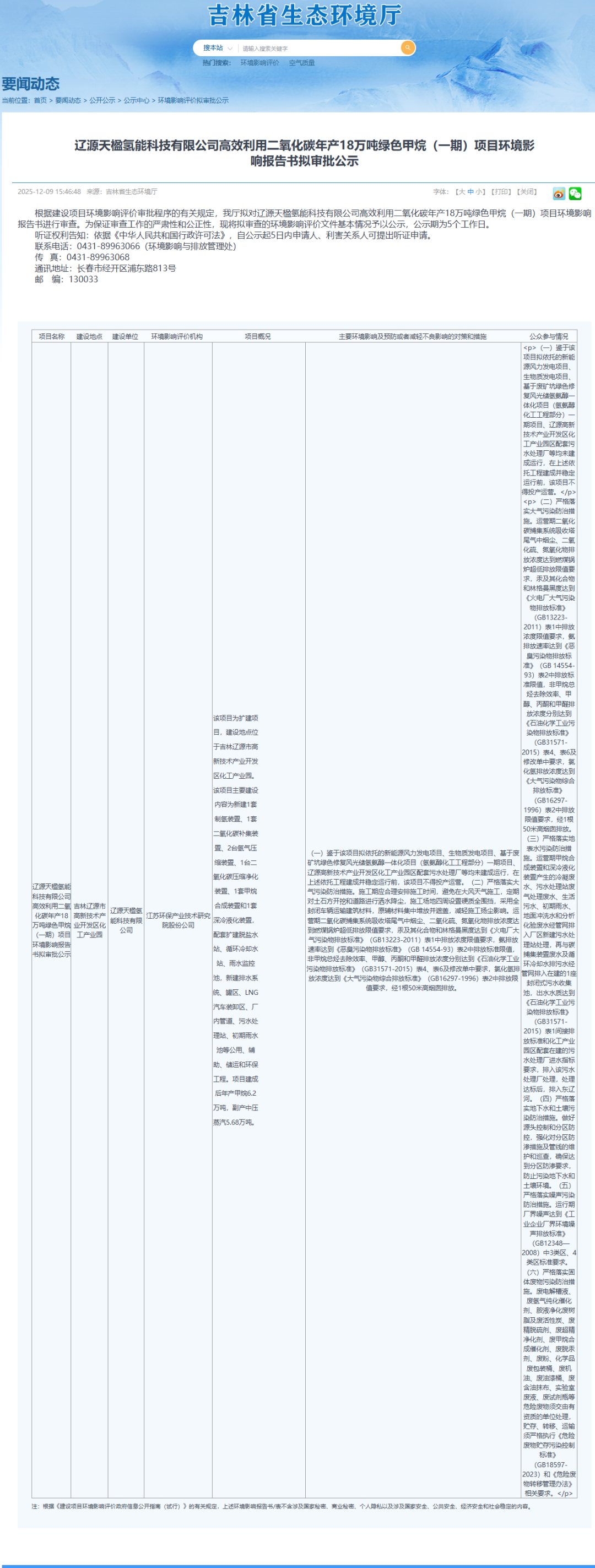 據(jù)了解,11月25日,吉林省生態(tài)環(huán)境廳發(fā)布遼源天楹氫能科技有限公司高效利用二氧化碳年產(chǎn)18萬噸綠色甲烷(一期)項目環(huán)境影響報告書受理情況公示。 根據(jù)公示,遼源天楹氫能科技有限公司高效利用二氧化碳年產(chǎn)18萬噸綠色甲烷(一期)項目位于遼源高新技術(shù)產(chǎn)業(yè)開發(fā)區(qū)化工產(chǎn)業(yè)園區(qū)內(nèi),為“風(fēng)光儲氫氨醇一體化”系列項目中的綠氫、綠色甲烷生產(chǎn)部分。 項目總投資450000萬元,主要建設(shè)內(nèi)容包括18萬噸/年規(guī)模甲烷生產(chǎn)裝置、104000Nm3/h制氫裝置、32000Nm3/h碳捕集裝置2及配套公輔工程。 項目建成后,通過捕集現(xiàn)有生物質(zhì)發(fā)電項目鍋爐煙氣中的二氧化碳,并與自產(chǎn)氫氣進(jìn)行綠色甲烷合成反應(yīng),理論上具備年產(chǎn)綠色甲烷18萬噸的潛力。然而,實際產(chǎn)能與裝置規(guī)模存在一定差距,預(yù)計項目建成后將實現(xiàn)年產(chǎn)綠色甲烷6.2萬噸/年。 據(jù)悉,2023年10月19日,基于相關(guān)發(fā)展背景,中國天楹與遼源市人民政府簽署了投資合作框架協(xié)議,雙方圍繞通過重力儲能實現(xiàn)廢礦坑綠色修復(fù),以及打造風(fēng)光儲氫氨醇項目等方面,達(dá)成了一系列深度合作共識。 中國天楹計劃在遼源高新技術(shù)產(chǎn)業(yè)開發(fā)區(qū)建設(shè)吉林天楹化工項目基地,全力推進(jìn)“風(fēng)光儲氫氨醇一體化”系列項目。該項目涵蓋風(fēng)力發(fā)電、生物質(zhì)發(fā)電、綠氫生產(chǎn)、綠色甲醇合成、綠色甲烷合成等多個核心板塊。 其中,風(fēng)力發(fā)電項目作為一體化項目的“綠色電力引擎”,為一體化項目提供綠電支持;生物質(zhì)發(fā)電項目則扮演“綜合能源供應(yīng)者”的角色,為一體化項目提供生物質(zhì)電、蒸汽和綠碳;綠氫生產(chǎn)為一體化項目提供綠氫原料;綠色甲醇合成、綠色甲烷合成項目分別為一體化項目提供綠色甲醇、綠色甲烷產(chǎn)品,該一體話項目打通了從綠電到綠色甲醇、綠色甲烷的全產(chǎn)業(yè)鏈,其創(chuàng)新的大規(guī)模、調(diào)峰式化工系統(tǒng),能夠適配風(fēng)電新能源的波動特性,兼具化學(xué)儲能和清潔生產(chǎn)雙重顯著優(yōu)勢。 在項目規(guī)劃方面,“風(fēng)光儲氫氨醇一體化”系列項目總體規(guī)劃建設(shè)2.6GW新能源發(fā)電設(shè)施,主要為風(fēng)力發(fā)電;配備400000Nm3/h電解制氫裝置,用于綠氫生產(chǎn);建設(shè)17萬噸/年甲醇裝置,實現(xiàn)綠色甲醇的規(guī)劃化合成;建設(shè)2×18萬噸/年綠色甲烷裝置,提升綠色甲烷的產(chǎn)能;同時建設(shè)生物質(zhì)發(fā)電裝置及配套公輔設(shè)施,保障項目的穩(wěn)定運行。