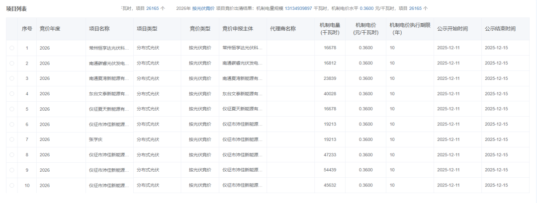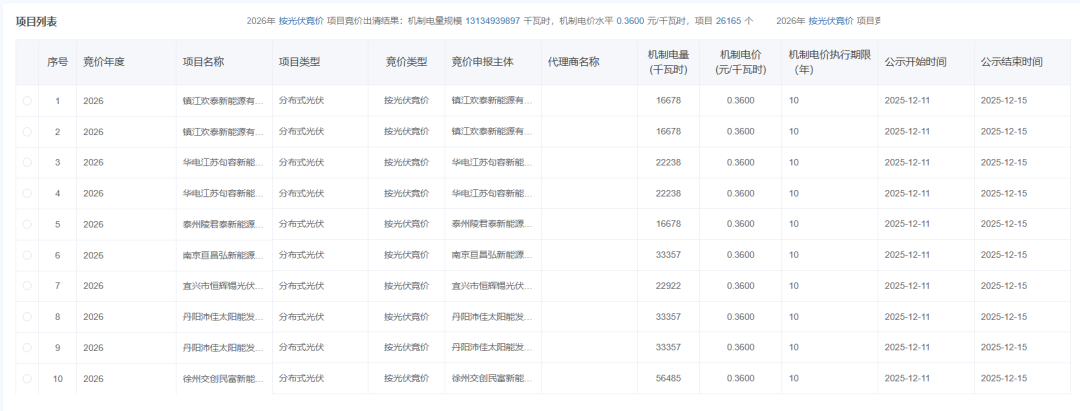12月11日,國網(wǎng)新能源云公示江蘇省機制電價競價結果,光伏機制電價為0.36元/度。 根據(jù)公示結果,本次入圍機制電量13134939897度,入圍項目共26165個,其中集中式光伏項目為105個。 根據(jù)江蘇136號文競價文件,本次競價機制電量總規(guī)模為130億千瓦時,其中:“海上風電項目”類別為10億千瓦時,“其他風電項目和光伏項目”類別為120億千瓦時。 從機制電量來看,入圍機制電量有所超額,海上風電項目則沒有競爭,全部由光伏項目使用。 機制電價方面,“海上風電項目”類別競價上限為0.391元/千瓦時,競價下限為0.3元/千瓦時;“其他風電項目和光伏項目”類別競價上限為0.391元/千瓦時,競價下限為0.25元/千瓦時。 從機制電價來看,基本貼近價格上限。此外,單個項目競價電量申報比例上限,不高于其預計年度上網(wǎng)電量的90%。執(zhí)行期限上,“海上風電項目”類別為15年;“其他風電項目和光伏項目”類別為10年。 具體見下:全部項目點擊跳轉(zhuǎn)鏈接→江蘇省機制電價競價結果