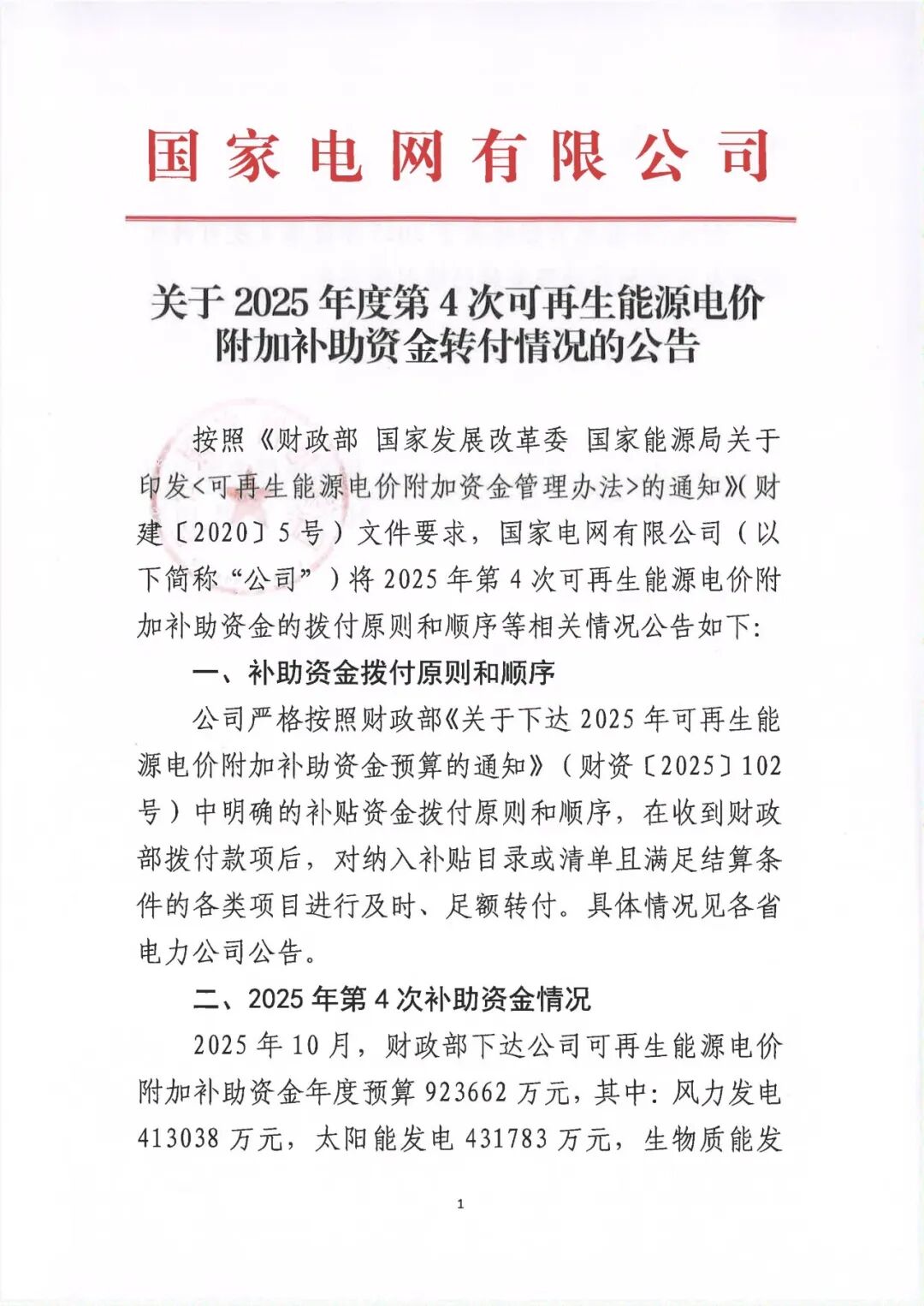 12月12日,國家電網(wǎng)有限公司關(guān)于2025年度第4次可再生能源電價附加補助資金轉(zhuǎn)付情況的公告。 根據(jù)公告,2025年10月,財政部下達公司可再生能源電價附加補助資金年度預(yù)算923662萬元,其中:風(fēng)力發(fā)電413038萬元,太陽能發(fā)電431783萬元,生物質(zhì)能發(fā)電 78841 萬元。