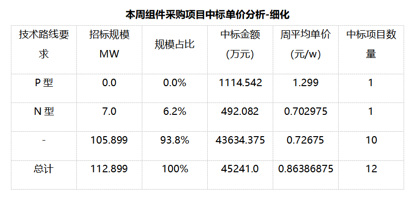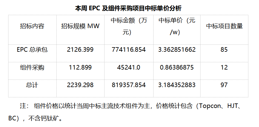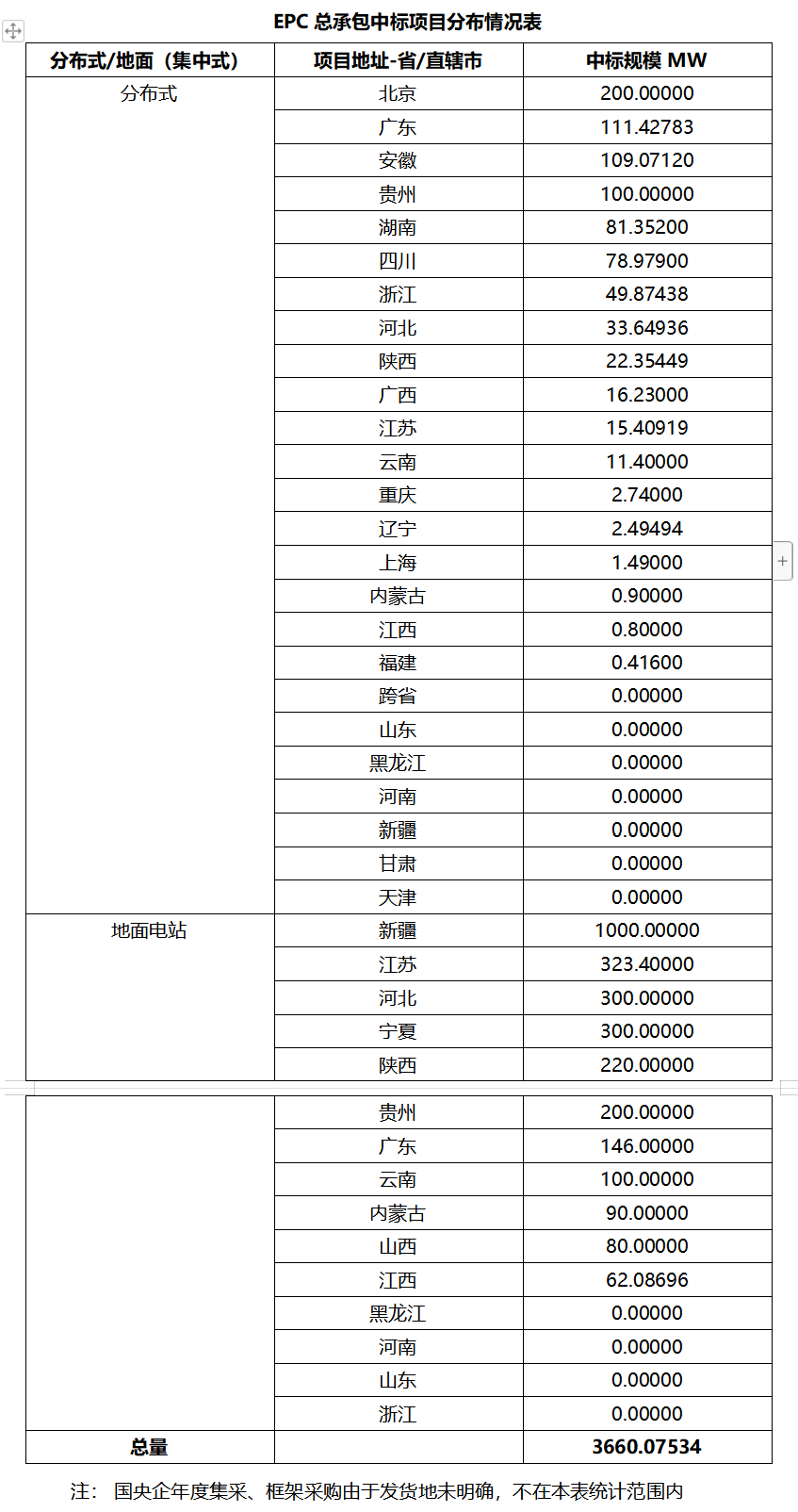 三、EPC總承包及組件采購(gòu)情況匯總 本月光伏EPC總承包中標(biāo)規(guī)模達(dá)2126.399MW,總中標(biāo)金額774116.854萬(wàn)元,平均中標(biāo)單價(jià)為3.362851662元/W,中標(biāo)數(shù)量85個(gè)。 本月光伏組件采購(gòu)中標(biāo)規(guī)模達(dá)112.899MW,總中標(biāo)金額45241.0萬(wàn)元,平均中標(biāo)單價(jià)為0.86386875元/W,中標(biāo)數(shù)量12個(gè)。