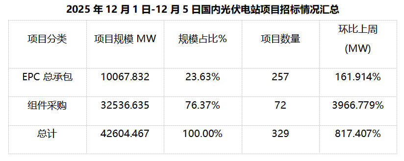 一、光伏項(xiàng)目招標(biāo)情況匯總: 根據(jù)Gessey蓋錫咨詢(xún)統(tǒng)計(jì),2025年12月1日-12月5日累計(jì)光伏招標(biāo)項(xiàng)目為329個(gè),項(xiàng)目規(guī)模合計(jì)為42604.467MW。光伏組件采購(gòu)招標(biāo)項(xiàng)目為72個(gè),招標(biāo)規(guī)模為32536.635MW,環(huán)比上周3966.779%。EPC總承包招標(biāo)項(xiàng)目為257個(gè),招標(biāo)規(guī)模為10067.832MW,環(huán)比上周161.914%。
