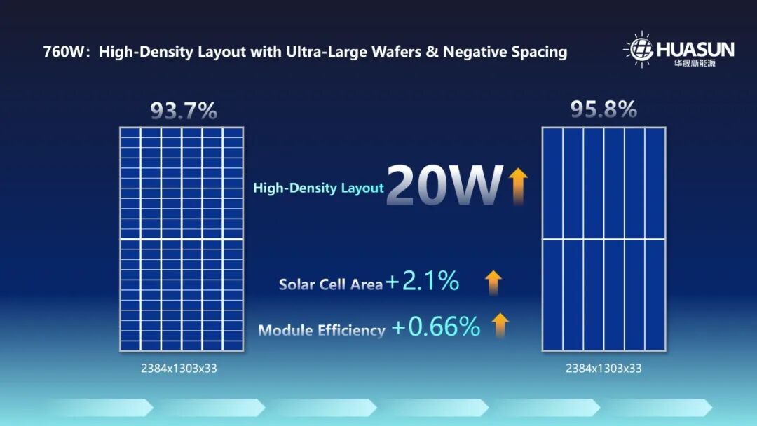 技術突破:成熟工藝締造高屏占比 Christian Comes指出,當前技術迭代的重點已從單一功率提升轉向系統(tǒng)級效能優(yōu)化。喜馬拉雅Plus 760HV組件融合超大硅片和負間距技術,組件電池面積提升2.1%,功率提升20W,效率提升0.66%,屏占比高達95.8%,從而實現(xiàn)功率密度與轉換效率的同步提高。