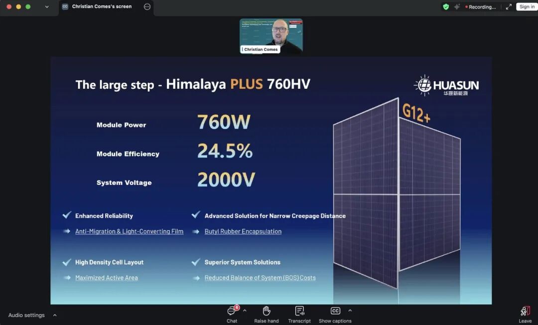 在近日舉辦的“High-Efficiency Solar Technologies 2025”國際技術論壇上,華晟新能源歐洲業(yè)務開發(fā)總監(jiān)Christian Comes向全球業(yè)界展示了最新量產的喜馬拉雅Plus 760HV異質結組件及其配套2000V系統(tǒng)解決方案。該產品以760W功率、24.5%轉換效率及行業(yè)領先的2000V系統(tǒng)電壓等級,引領光伏技術競爭進入以系統(tǒng)價值為核心的新階段。