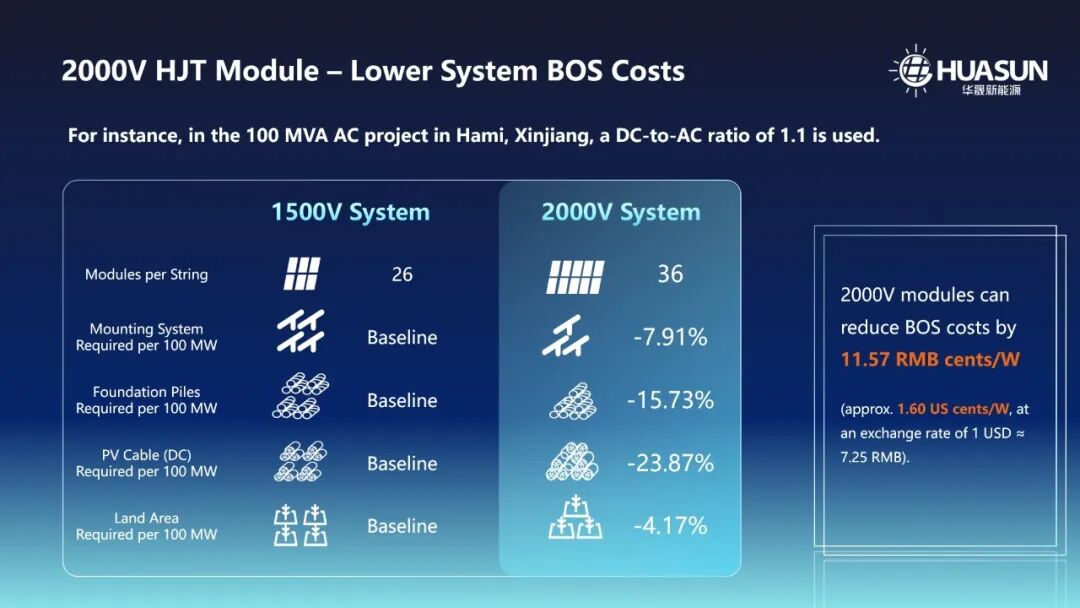 系統(tǒng)重構:2000V電壓平臺帶來成本結構變革 本次新品亮相的核心在于2000V系統(tǒng)電壓的規(guī)?;瘧谩攲嵉臏y算數(shù)據(jù)表明,電壓等級提升將直接改變電站投資模型。以新疆哈密100MW光伏項目為例,相較于主流1500V TOPCon方案,采用2000V系統(tǒng)的HJT 760W組件可降低初始投資約0.15元/瓦,其中BOS成本下降達11.57分/瓦。