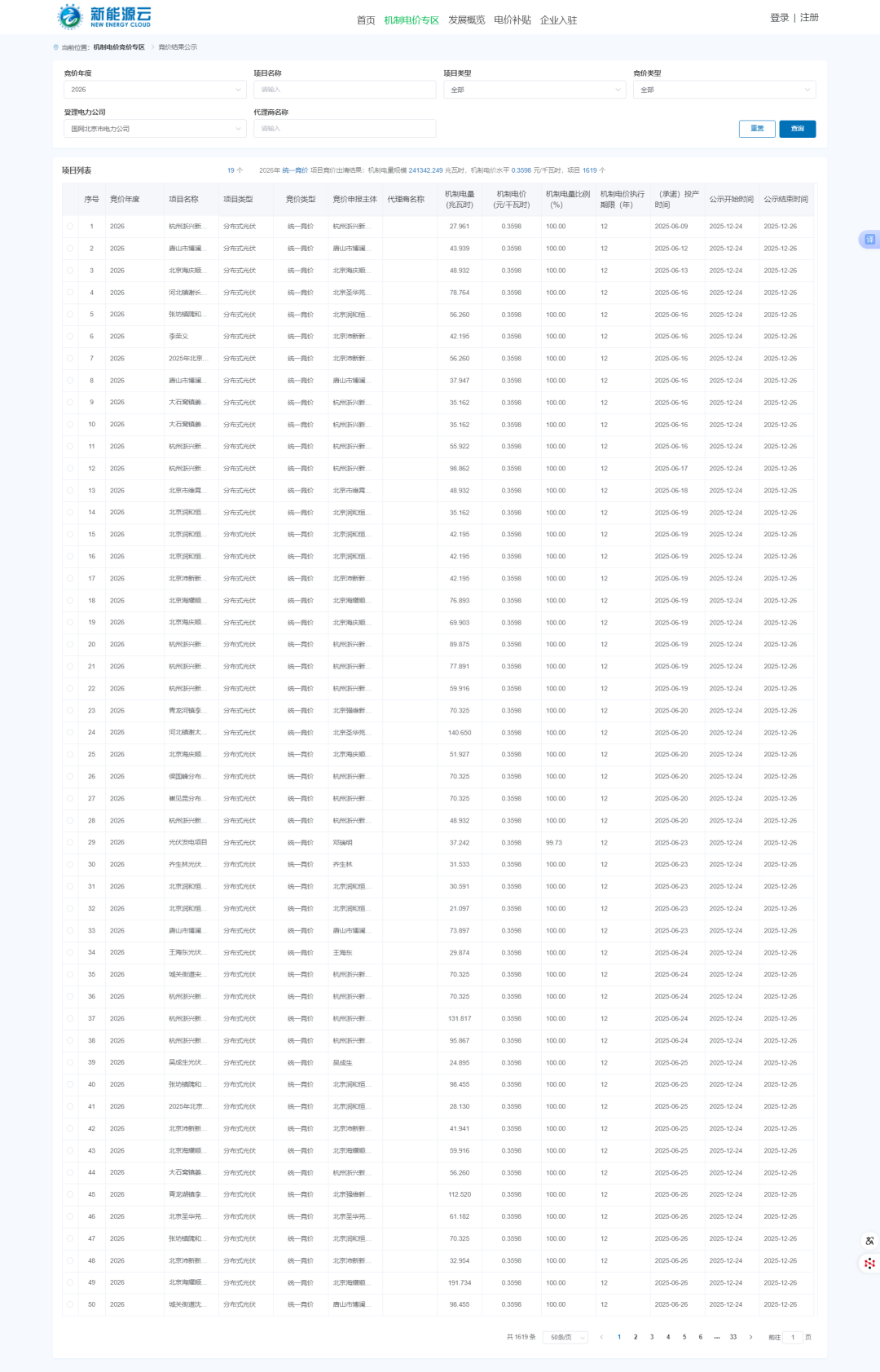 12月19日,國網(wǎng)新能源云公示北京市2026年新能源增量項目機(jī)制電價競價結(jié)果,機(jī)制電量規(guī)模241342.249兆瓦時,機(jī)制電價水平0.3598元/千瓦時,項目1619個。