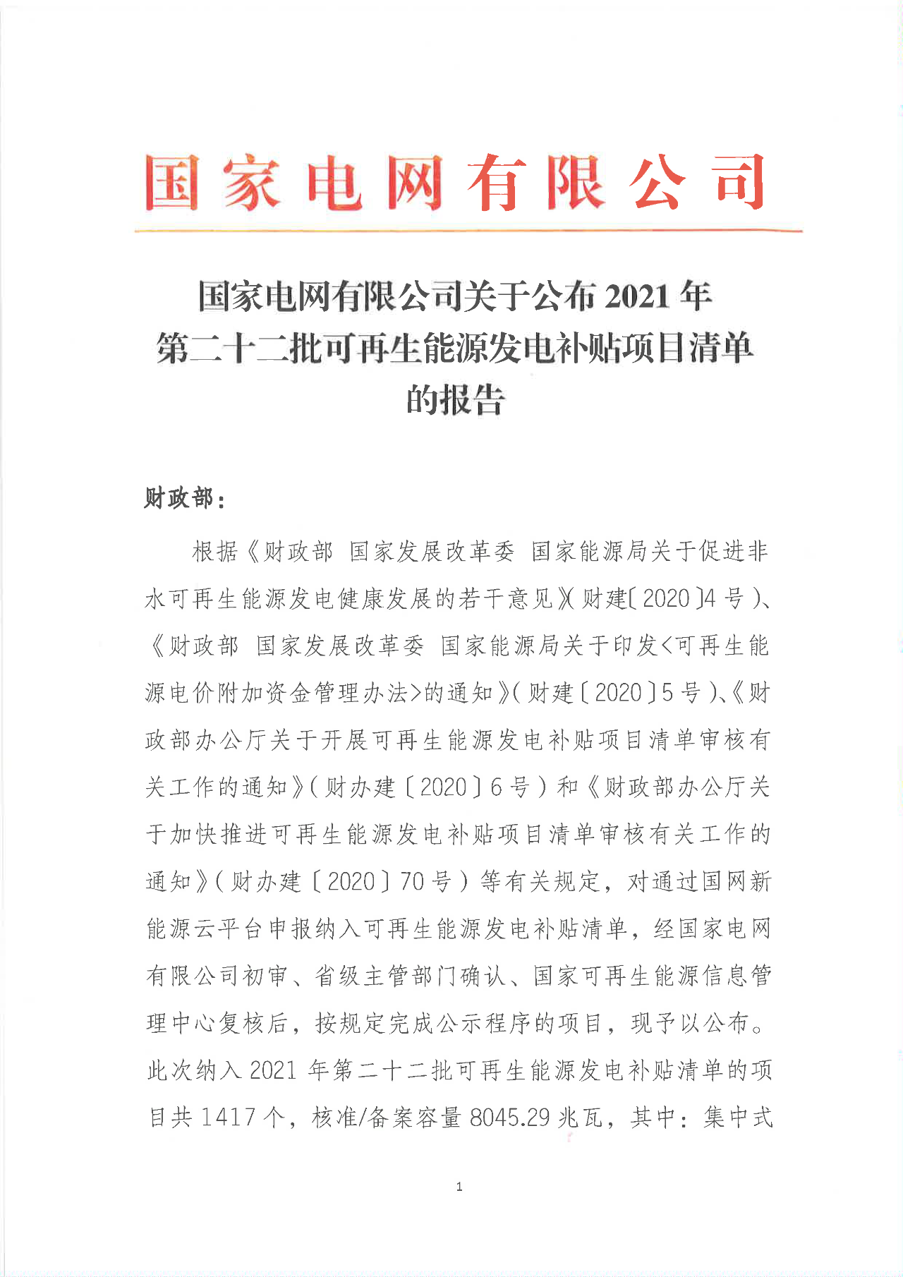 國網(wǎng)新能源云平臺公布2021年第二十二批可再生能源發(fā)電補貼項目清單,公告顯示納入本批次的項目共計1417個,核準/備案容量8045.29MW。其中納入本批的集中式和分布式太陽能發(fā)電項目數(shù)量分別為76個、1286個,核準/備案容量分別為2379.03兆瓦、1836.46兆瓦,共計4215.49兆瓦。 原文如下: 根據(jù)《財政部 國家發(fā)展改革委 國家能源局關(guān)于促進非水可再生能源發(fā)電健康發(fā)展的若干意見》(財建〔2020〕4號)、《財政部 國家發(fā)展改革委 國家能源局關(guān)于印發(fā)<可再生能源電價附加資金管理辦法>的通知》(財建〔2020〕5號)、《財政部辦公廳關(guān)于開展可再生能源發(fā)電補貼項目清單審核有關(guān)工作的通知》(財辦建〔2020〕6號)和《財政部辦公廳關(guān)于加快推進可再生能源發(fā)電補貼項目清單審核有關(guān)工作的通知》(財辦建〔2020〕70號)等有關(guān)規(guī)定,國家電網(wǎng)有限公司積極配合各省級能源主管部門和國家可再生能源信息管理中心,為符合中央財政補助條件的可再生能源發(fā)電項目提供補貼清單申報服務(wù)。根據(jù)《財政部關(guān)于下達2021年可再生能源電價附加補助資金預(yù)算的通知》(財資〔2021〕94號)規(guī)定,2019年底前完成并網(wǎng)的項目,原則上應(yīng)在2021年底前完成補貼清單審核;2020年起并網(wǎng)的項目,原則上應(yīng)在并網(wǎng)后一年內(nèi)完成補貼清單審核。2021年11月30日,我公司已將完成公示的2021年第二十二批可再生能源發(fā)電項目補貼項目清單上報國家主管部門,已公布項目清單及后續(xù)項目審核進展情況,請登錄新能源云平臺查詢。 國家電網(wǎng)有限公司 2021年11月30日