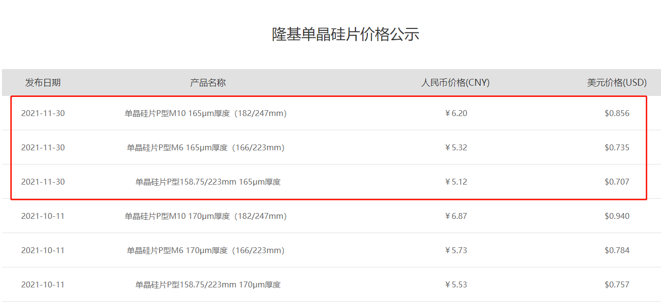 11月30日,隆基公布最新硅片報(bào)價(jià),其中P型M6 價(jià)格為5.73元/片,與10月11日報(bào)價(jià)相比,下降0.41元/片。P型158.75/223mm價(jià)格為5.53元/片,與10月11日報(bào)價(jià)相比,下降0.41元/片。P型 M10價(jià)格為6.20元/片,與10月11日報(bào)價(jià)相比,下降0.67元/片。值得注意的是,硅片的厚度更新為165μm。
