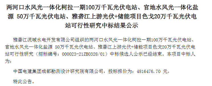 雅礱江流域水電開發(fā)有限公司發(fā)布了兩河口水風光一體化柯拉一期100萬千瓦光伏電站、官地水風光一體化鹽源 50萬千瓦光伏電站、雅礱江上游光伏+儲能項目色戈20萬千瓦光伏電站可行性研究中標結果公示,中國電建集團成都勘測設計研究院有限公司以481.64767萬中標。