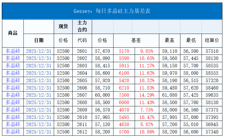 現(xiàn)貨市場(chǎng)價(jià)格變動(dòng): 多晶硅: 今日硅料價(jià)格整體維穩(wěn),N型料主流價(jià)格在50-56元/公斤,均價(jià)52.5元/公斤。N型顆粒硅主流價(jià)格在47-51元/公斤,均價(jià)50元/公斤。國(guó)產(chǎn)復(fù)投特級(jí)硅料主流價(jià)格在36-44元/公斤,均價(jià)43.5元/公斤,國(guó)產(chǎn)致密特級(jí)硅料主流價(jià)格在35-43元/公斤,均價(jià)42.5元/公斤。全球多晶硅料主流價(jià)格在19-22元/公斤,均價(jià)20元/公斤。 硅片: 今日硅片價(jià)格整體維穩(wěn),N型-183.75mm單晶硅片主流現(xiàn)貨價(jià)格維持1.22-1.4元/片,均價(jià)1.25元/片。N型-210mm單晶硅片主流現(xiàn)貨價(jià)格維持1.5-1.7元/片,均價(jià)1.55元/片。N型-210Rmm單晶硅片主流現(xiàn)貨價(jià)格1.3-1.5元/片,均價(jià)1.35元/片。 電池片: 今日電池片價(jià)格整體維穩(wěn),24.3%以上183.75mm雙面Topcon電池片主流價(jià)格在0.35-0.4元/瓦,均價(jià)0.37元/瓦。24.3%以上210mm雙面Topcon電池片主流價(jià)格在0.35-0.4元/瓦,均價(jià)0.38元/瓦。24.3%以上210Rmm雙面Topcon電池片主流價(jià)格在0.35-0.4元/瓦,均價(jià)0.37元/瓦。 組件: 今日組件價(jià)格整體維穩(wěn),N型雙面Topcon組件(182系列)價(jià)格在0.66-0.72元/瓦,均價(jià)為0.685元/瓦。N型雙面Topcon組件(210系列)價(jià)格在0.66-0.7元/瓦,均價(jià)為0.69元/瓦。N型雙面Topcon組件(210系列)(700-725W(60片)價(jià)格在0.65-0.7元/瓦,均價(jià)為0.69元/瓦。N型雙面Topcon組件(210R系列)(610-635W(60片))價(jià)格在0.65-0.7元/瓦,均價(jià)為0.68元/瓦。N型雙面HJT組件(210系列)價(jià)格在0.77-0.79元/瓦,均價(jià)為0.78元/瓦。N型雙面BC組件(210R系列)價(jià)格在0.75-0.78元/瓦,均價(jià)為0.76元/瓦。中國(guó)區(qū)分布式項(xiàng)目(≥595W)價(jià)格在0.66-0.69元/瓦,均價(jià)為0.66元/瓦,中國(guó)區(qū)分布式項(xiàng)目(≥615W)價(jià)格在0.68-0.71元/瓦,均價(jià)為0.685元/瓦,中國(guó)區(qū)集中式項(xiàng)目(≥585W)價(jià)格在0.69-0.735元/瓦,均價(jià)為0.68元/瓦。N型雙面BC組件(210R系列)集中式項(xiàng)目?jī)r(jià)格在0.74-0.78元/瓦,均價(jià)為0.75元/瓦。歐洲港口現(xiàn)貨價(jià)格在0.082-0.09美元/瓦,均價(jià)為0.089美元/瓦。印度港口現(xiàn)貨價(jià)格在0.2-0.22美元/瓦,均價(jià)為0.21美元/瓦。美國(guó)港口現(xiàn)貨價(jià)格在0.26-0.28美元/瓦,均價(jià)為0.265美元/瓦。 玻璃: 今日玻璃價(jià)格整體維穩(wěn),3.2mm雙層鍍膜光伏玻璃價(jià)格在19.5-20.5元/平方米,均價(jià)為20元/平方米。2.0mm單層鍍膜光伏玻璃價(jià)格在11-12.5元/平方米,均價(jià)為12.5元/平方米。2.0mm雙層鍍膜光伏玻璃價(jià)格在12-13.5元/平方米,均價(jià)為13.5元/平方米。2.0mm背面光伏玻璃價(jià)格在10.5-12元/平方米,均價(jià)為11.5元/平方米。 聚焦每日行情波動(dòng): 2025年的最后一天,光伏市場(chǎng)各環(huán)節(jié)報(bào)價(jià)保持穩(wěn)定。元旦前夕,全球各大市場(chǎng)因新年假期紛紛休市,廠家也相應(yīng)維穩(wěn)報(bào)價(jià)。近期電池片價(jià)格持續(xù)走高,致使組件生產(chǎn)成本大幅攀升,組件企業(yè)承受著巨大壓力。對(duì)此,組件針對(duì)新報(bào)價(jià)已有顯著抬升,但受假期影響,各廠家暫未正式執(zhí)行新價(jià)格。 本周電池片價(jià)格上漲,基于海外市場(chǎng)需求有支撐,部分頭部企業(yè)電池片報(bào)價(jià)0.4元/瓦已有成交,國(guó)內(nèi)市場(chǎng)則仍處于對(duì)價(jià)格的適應(yīng)和接受過(guò)程中,整體成交均價(jià)維持在0.37-0.38元/瓦,國(guó)內(nèi)項(xiàng)目正處淡季,市場(chǎng)活躍度有待提升,價(jià)格接受度的提高還需時(shí)日。 展望2026年,光伏市場(chǎng)充滿機(jī)遇與挑戰(zhàn),預(yù)計(jì)年后整體價(jià)格走勢(shì)仍有待進(jìn)一步觀察,市場(chǎng)各方都在密切關(guān)注原材料供應(yīng)、政策變動(dòng)以及市場(chǎng)需求等因素的變化。 值此元旦佳節(jié)來(lái)臨之際,衷心感謝大家一直以來(lái)對(duì)蓋錫咨詢團(tuán)隊(duì)的關(guān)注與支持!愿新的一年里,行業(yè)蓬勃發(fā)展,各位事業(yè)順?biāo)?,幸福安康!最新的行情日?qǐng)?bào)預(yù)計(jì)于2026年1月4日發(fā)送,敬請(qǐng)持續(xù)關(guān)注市場(chǎng)動(dòng)態(tài)。 期貨市場(chǎng)