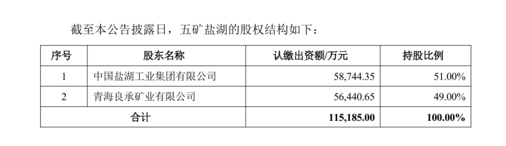 中國鹽湖于2024年10月24日成立,為中國五礦集團(tuán)有限公司、青海省國有資產(chǎn)投資管理有限公司及青海省政府國有資產(chǎn)監(jiān)督管理委員會(huì)共同投資的有限責(zé)任公司。截至公告披露日,中國鹽湖持有五礦鹽湖51%股權(quán),交易結(jié)束后,青海鹽湖工業(yè)股份有限公司將持有五礦鹽湖51%股權(quán)。
