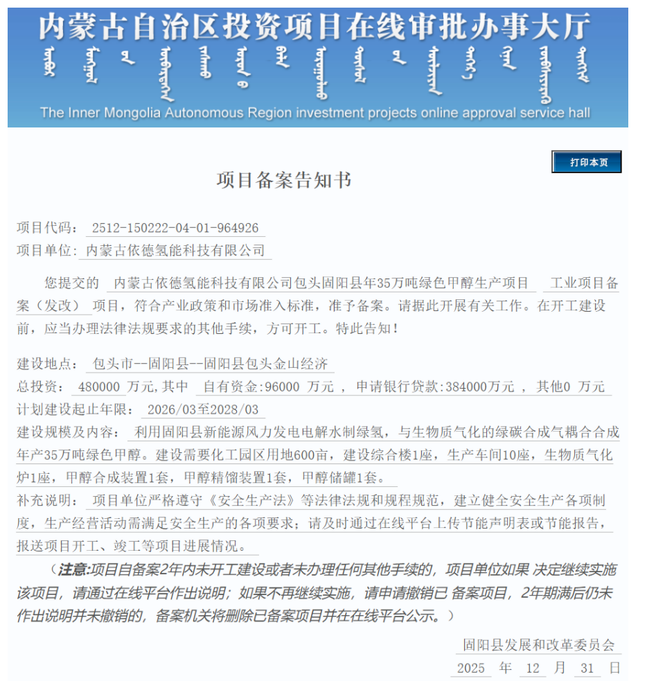 12月31日,內(nèi)蒙古依德氫能科技有限公司包頭固陽(yáng)縣年35萬(wàn)噸綠色甲醇生產(chǎn)項(xiàng)目獲備案。 該項(xiàng)目位于包頭市--固陽(yáng)縣--固陽(yáng)縣包頭金山經(jīng)濟(jì),項(xiàng)目單位為內(nèi)蒙古依德氫能科技有限公司,總投資480000萬(wàn)元。 建設(shè)規(guī)模及內(nèi)容:利用固陽(yáng)縣新能源風(fēng)力發(fā)電電解水制綠氫,與生物質(zhì)氣化的綠碳合成氣耦合合成年產(chǎn)35萬(wàn)噸綠色甲醇。建設(shè)需要化工園區(qū)用地600畝,建設(shè)綜合樓1座,生產(chǎn)車間10座,生物質(zhì)氣化爐1座,甲醇合成裝置1套,甲醇精餾裝置1套,甲醇儲(chǔ)罐1套。 計(jì)劃建設(shè)起止年限:2026年3月至2028年3月。