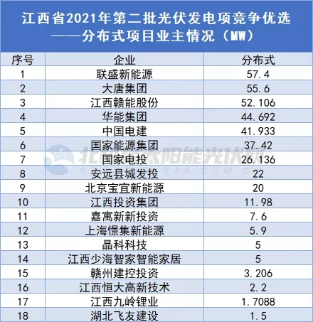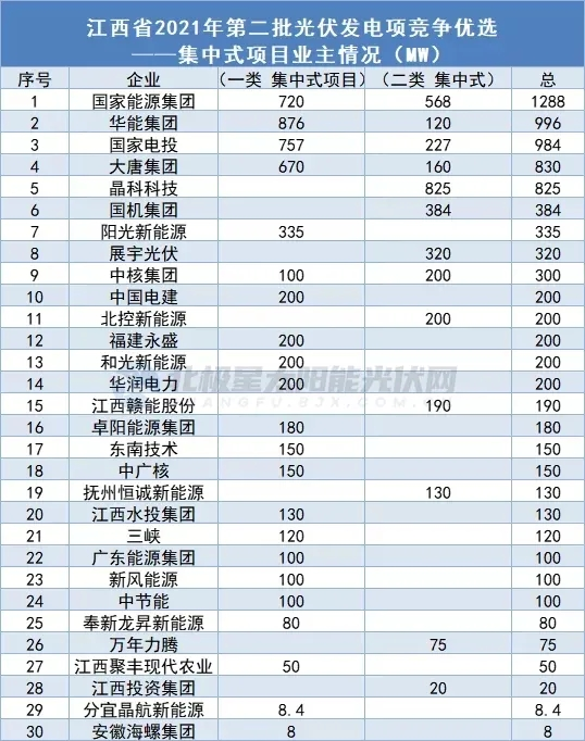 11月30日,江西省能源局公布2021年第二批光伏發(fā)電競爭優(yōu)選結果,項目總規(guī)模約9.2547818GW。其中,一類分布式光伏項目99個,共計401.3818MW,一類集中式光伏項目共56個,共計5.4344GW;二類集中式光伏項目共36個,共計3.419GW。 從項目業(yè)主來看,集中式光伏項目中,國家能源集團的項目規(guī)模超過1GW,華能、國家電投、大唐緊隨其后,民營企業(yè)中由晶科科技領跑,入圍項目規(guī)模達825MW。