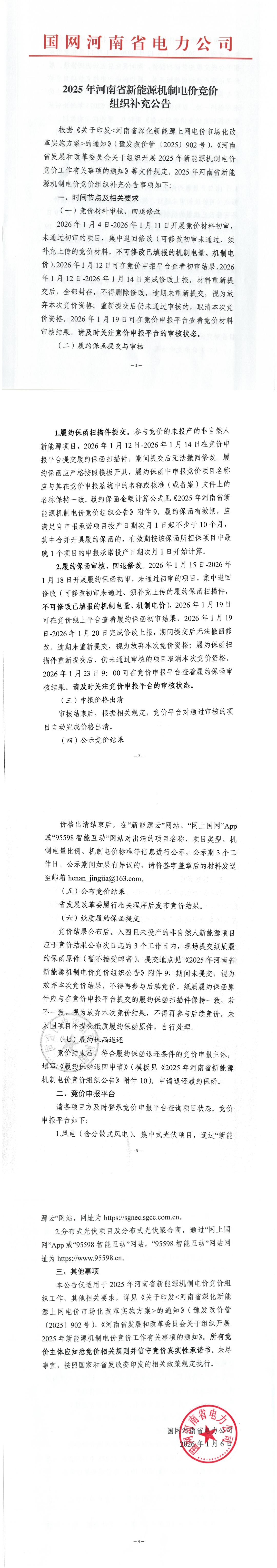 2026年1月6日,國(guó)網(wǎng)河南省電力公司發(fā)布《2025 年河南省新能源機(jī)制電價(jià)競(jìng)價(jià)組織補(bǔ)充公告》,明確競(jìng)價(jià)材料及履約保函的審核流程、時(shí)間節(jié)點(diǎn)與相關(guān)要求。 詳情見(jiàn)下: