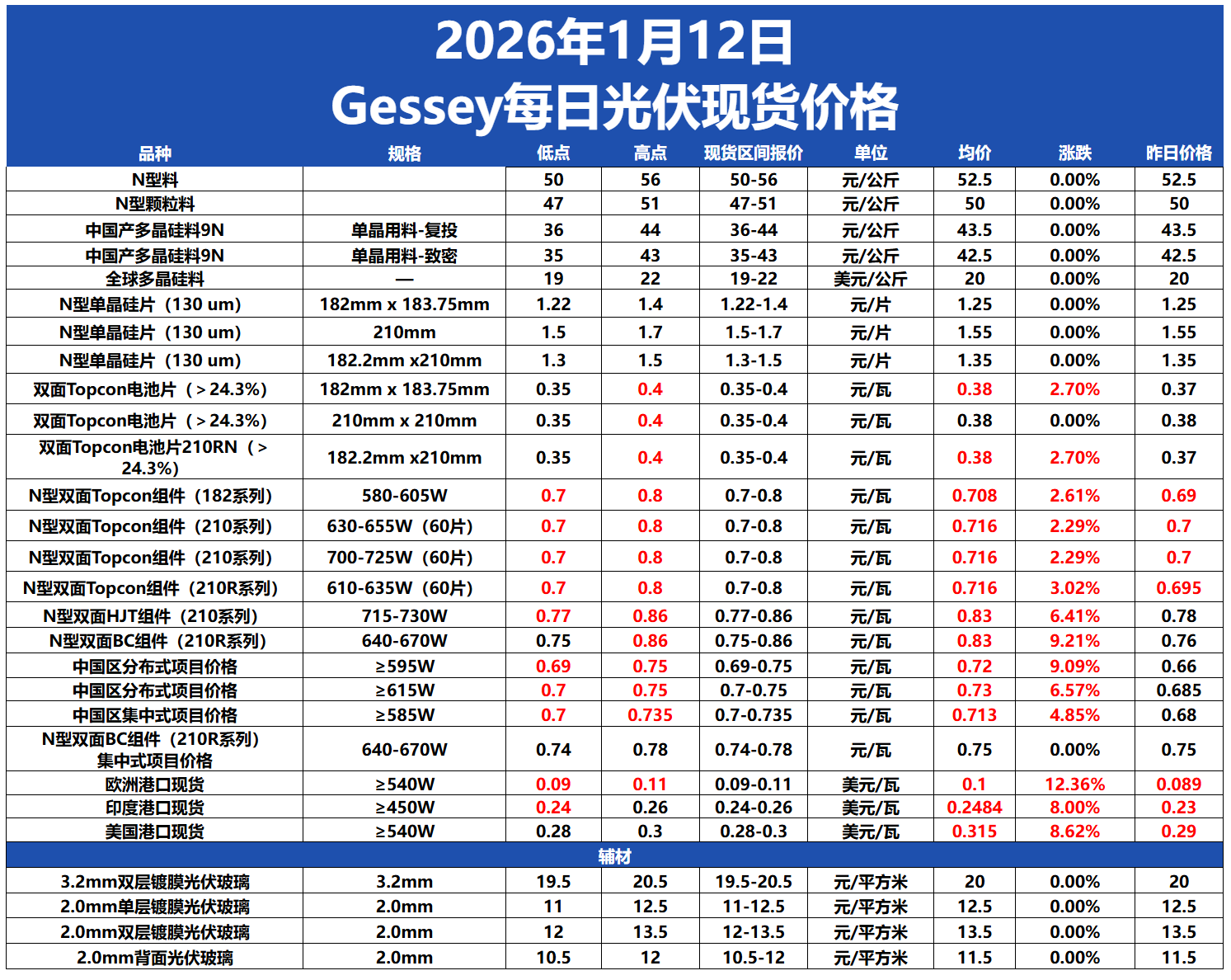 現貨市場價格變動: 多晶硅: 今日硅料價格整體維穩(wěn),N型料主流價格在50-56元/公斤,均價52.5元/公斤。N型顆粒硅主流價格在47-51元/公斤,均價50元/公斤。國產復投特級硅料主流價格在36-44元/公斤,均價43.5元/公斤,國產致密特級硅料主流價格在35-43元/公斤,均價42.5元/公斤。全球多晶硅料主流價格在19-22元/公斤,均價20元/公斤。 硅片: 今日硅片價格整體維穩(wěn),N型-183.75mm單晶硅片主流現貨價格維持1.22-1.4元/片,均價1.25元/片。N型-210mm單晶硅片主流現貨價格維持1.5-1.7元/片,均價1.55元/片。N型-210Rmm單晶硅片主流現貨價格1.3-1.5元/片,均價1.35元/片。 電池片: 今日電池片價格小幅上漲,24.3%以上183.75mm雙面Topcon電池片主流價格在0.35-0.4元/瓦,均價0.38元/瓦,上漲2.7%。24.3%以上210mm雙面Topcon電池片主流價格在0.35-0.4元/瓦,均價0.38元/瓦。24.3%以上210Rmm雙面Topcon電池片主流價格在0.35-0.4元/瓦,均價0.38元/瓦,上漲2.7%。 組件: 今日組件價格小幅上漲,N型雙面Topcon 組件(182系列)價格在0.7-0.8元/ 瓦,均價為0.708元/瓦,上漲2.61%。N型雙面Topcon 組件(210系列)價格在0.7-0.8元/ 瓦,均價為0.716元/瓦,上漲2.29%。N型雙面Topcon組件(210系列)(700-725W(60片)價格在0.7-0.8元/ 瓦,均價為0.716元/瓦,上漲2.29%。N型雙面Topcon組件(210R系列)(610-635W(60片))價格在0.7-0.78元/ 瓦,均價為0.716元/瓦,上漲3.02%。N型雙面HJT組件(210系列)價格在0.77-0.86元/ 瓦,均價為0.83元/瓦。N型雙面BC組件(210R系列)價格在0.75-0.86元/ 瓦,均價為0.83元/瓦。中國區(qū)分布式項目(≥595W)價格在0.69-0.75元/瓦,均價為0.72元/瓦,上漲9.09%,中國區(qū)分布式項目(≥615W)價格在0.7-0.75元/瓦,均價為0.73元/瓦,上漲6.57%,中國區(qū)集中式項目(≥585W)價格在0.7-0.735元/ 瓦,均價為0.713元/瓦,上漲4.85%。N型雙面BC組件(210R系列)集中式項目價格在0.74-0.78元/ 瓦,均價為0.75元/瓦。歐洲港口現貨價格在0.09-0.11美元/ 瓦,均價為0.1美元/瓦,上漲12.36%。印度港口現貨價格在0.24-0.26美元/ 瓦,均價為0.2484美元/瓦,上漲8.00%。美國港口現貨價格在0.28-0.3美元/ 瓦,均價為0.315美元/瓦,上漲8.62%。 玻璃: 今日玻璃價格整體維穩(wěn),3.2mm雙層鍍膜光伏玻璃價格在19.5-20.5元/平方米,均價為20元/平方米。2.0mm單層鍍膜光伏玻璃價格在11-12.5元/平方米,均價為12.5元/平方米。2.0mm雙層鍍膜光伏玻璃價格在12-13.5元/平方米,均價為13.5元/平方米。2.0mm背面光伏玻璃價格在10.5-12元/平方米,均價為11.5元/平方米。 聚焦每日行情波動: 今日電池片價格小幅上漲,24.3%以上183.75mm雙面Topcon電池片主流價格在0.35-0.4元/瓦,均價0.38元/瓦,上漲2.7%。24.3%以上210mm雙面Topcon電池片主流價格在0.35-0.4元/瓦,均價0.38元/瓦。24.3%以上210Rmm雙面Topcon電池片主流價格在0.35-0.4元/瓦,均價0.38元/瓦,上漲2.7%。 今日組件價格小幅上漲,N型雙面Topcon 組件(182系列)價格在0.7-0.8元/ 瓦,均價為0.708元/瓦,上漲2.61%。N型雙面Topcon 組件(210系列)價格在0.7-0.8元/ 瓦,均價為0.716元/瓦,上漲2.29%。N型雙面Topcon組件(210系列)(700-725W(60片)價格在0.7-0.8元/ 瓦,均價為0.716元/瓦,上漲2.29%。N型雙面Topcon組件(210R系列)(610-635W(60片))價格在0.7-0.78元/ 瓦,均價為0.716元/瓦,上漲3.02%。中國區(qū)分布式項目(≥595W)價格在0.69-0.75元/瓦,均價為0.72元/瓦,上漲9.09%,中國區(qū)分布式項目(≥615W)價格在0.7-0.75元/瓦,均價為0.73元/瓦,上漲6.57%,中國區(qū)集中式項目(≥585W)價格在0.7-0.735元/ 瓦,均價為0.713元/瓦,上漲4.85%。歐洲港口現貨價格在0.09-0.11美元/ 瓦,均價為0.1美元/瓦,上漲12.36%。印度港口現貨價格在0.24-0.26美元/ 瓦,均價為0.2484美元/瓦,上漲8.00%。美國港口現貨價格在0.28-0.3美元/ 瓦,均價為0.315美元/瓦,上漲8.62%。 由于上周五公布的光伏出口退稅歸零政策落地后,頭部組件企業(yè)均主動調高報價,今日最新歐洲現貨也同步調漲,目前針對海外出口訂單報價在0.1-0.11美元/瓦,而國內現貨組件報價也調高至0.76-0.78元/瓦,部分企業(yè)今日還未更新報價?;诤罄m(xù)4月1日前“搶出口”促使較多企業(yè)已考慮本周開始主動調高開工率。 期貨市場