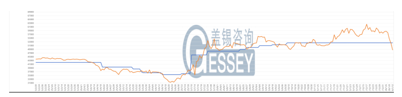 行情走勢:主力合約收盤價為48725元/噸,前結算價為53190元/噸,收盤價較前結算價跌幅為8.39%,收盤價較開盤價跌2215元/噸,跌幅為4.35%,成交量為16手,持倉量為9手。