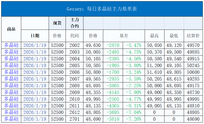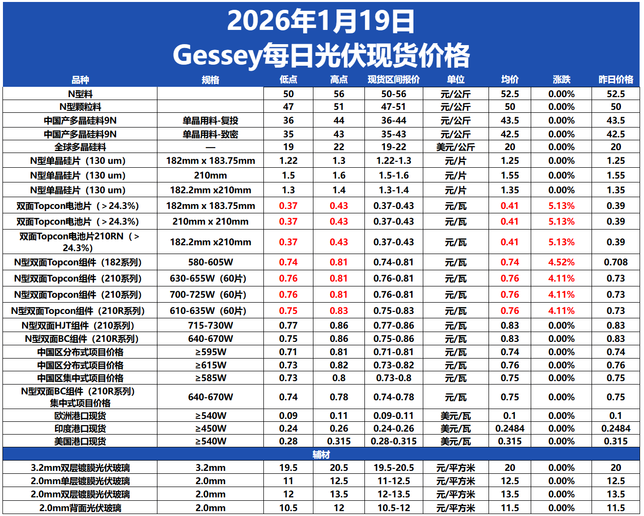 現(xiàn)貨市場價格變動: 多晶硅: 今日硅料價格整體維穩(wěn),N型料主流價格在50-56元/公斤,均價52.5元/公斤。N型顆粒硅主流價格在47-51元/公斤,均價50元/公斤。國產(chǎn)復投特級硅料主流價格在36-44元/公斤,均價43.5元/公斤,國產(chǎn)致密特級硅料主流價格在35-43元/公斤,均價42.5元/公斤。全球多晶硅料主流價格在19-22元/公斤,均價20元/公斤。 硅片: 今日硅片價格整體維穩(wěn),N型-183.75mm單晶硅片主流現(xiàn)貨價格維持1.22-1.4元/片,均價1.25元/片。N型-210mm單晶硅片主流現(xiàn)貨價格維持1.5-1.7元/片,均價1.55元/片。N型-210Rmm單晶硅片主流現(xiàn)貨價格1.3-1.5元/片,均價1.35元/片。 電池片: 今日電池片價格小幅上漲,24.3%以上183.75mm雙面Topcon電池片主流價格在0.37-0.43元/瓦,均價0.41元/瓦,上漲5.13%。24.3%以上210mm雙面Topcon電池片主流價格在0.37-0.43元/瓦,均價0.41元/瓦,上漲5.13%。24.3%以上210Rmm雙面Topcon電池片主流價格在0.37-0.43元/瓦,均價0.41元/瓦,上漲5.13%。 組件: 今日組件價格小幅上漲,N型雙面Topcon組件(182系列)價格在0.74-0.81元/瓦,均價為0.74元/瓦,上漲4.52%。N型雙面Topcon組件(210系列)價格在0.76-0.81元/瓦,均價為0.76元/瓦,上漲4.11%。N型雙面Topcon組件(210系列)(700-725W(60片)價格在0.76-0.81元/瓦,均價為0.76元/瓦,上漲4.11%。N型雙面Topcon組件(210R系列)(610-635W(60片))價格在0.75-0.83元/瓦,均價為0.76元/瓦,上漲4.11%。N型雙面HJT組件(210系列)價格在0.77-0.86元/瓦,均價為0.83元/瓦。N型雙面BC組件(210R系列)價格在0.75-0.86元/瓦,均價為0.83元/瓦。中國區(qū)分布式項目(≥595W)價格在0.71-0.81元/瓦,均價為0.74元/瓦,中國區(qū)分布式項目(≥615W)價格在0.73-0.82元/瓦,均價為0.76元/瓦,中國區(qū)集中式項目(≥585W)價格在0.73-0.8元/瓦,均價為0.75元/瓦。N型雙面BC組件(210R系列)集中式項目價格在0.74-0.78元/瓦,均價為0.75元/瓦。歐洲港口現(xiàn)貨價格在0.09-0.11美元/瓦,均價為0.1美元/瓦。印度港口現(xiàn)貨價格在0.24-0.26美元/瓦,均價為0.2484美元/瓦。美國港口現(xiàn)貨價格在0.28-0.315美元/瓦,均價為0.315美元/瓦。 玻璃: 今日玻璃價格整體維穩(wěn),3.2mm雙層鍍膜光伏玻璃價格在19.5-20.5元/平方米,均價為20元/平方米。2.0mm單層鍍膜光伏玻璃價格在11-12.5元/平方米,均價為12.5元/平方米。2.0mm雙層鍍膜光伏玻璃價格在12-13.5元/平方米,均價為13.5元/平方米。2.0mm背面光伏玻璃價格在10.5-12元/平方米,均價為11.5元/平方米。 聚焦每日行情波動: 今日電池片價格小幅上漲,24.3%以上183.75mm雙面Topcon電池片主流價格在0.37-0.43元/瓦,均價0.41元/瓦,上漲5.13%。24.3%以上210mm雙面Topcon電池片主流價格在0.37-0.43元/瓦,均價0.41元/瓦,上漲5.13%。24.3%以上210Rmm雙面Topcon電池片主流價格在0.37-0.43元/瓦,均價0.41元/瓦,上漲5.13%。 今日組件價格小幅上漲,N型雙面Topcon組件(182系列)價格在0.74-0.81元/瓦,均價為0.74元/瓦,上漲4.52%。N型雙面Topcon組件(210系列)價格在0.76-0.81元/瓦,均價為0.76元/瓦,上漲4.11%。N型雙面Topcon組件(210系列)(700-725W(60片)價格在0.76-0.81元/瓦,均價為0.76元/瓦,上漲4.11%。N型雙面Topcon組件(210R系列)(610-635W(60片))價格在0.75-0.83元/瓦,均價為0.76元/瓦,上漲4.11%。 電池片方面,受白銀價格持續(xù)飆升影響,電池片生產(chǎn)成本顯著增加。由于利潤被擠壓,企業(yè)為維持盈利空間,選擇調(diào)高價格。24.3%以上183.75mm、210mm及210Rmm雙面Topcon電池片主流價格均來到0.37-0.43元/瓦,均價達0.41元/瓦,較之前上漲5.13%。周初,各電池片企業(yè)便因成本因素低價惜售,隨著成本壓力持續(xù)加大,最新的高位報價已調(diào)高到0.43元/瓦。 組件方面,因上游電池片價格上漲,成本傳導至組件端,使得組件價格也隨之上升。N型雙面Topcon組件(182系列)價格在0.74-0.81元/瓦,均價為0.74元/瓦,上漲4.52%;N型雙面Topcon組件(210系列)相關(guān)產(chǎn)品價格也有類似漲幅,均價達到0.76元/瓦,上漲幅度在4.11%左右。目前,部分組件企業(yè)雖尚未更新報價,但市場最新成交價已陸續(xù)抬漲至0.78元/瓦。 期貨市場