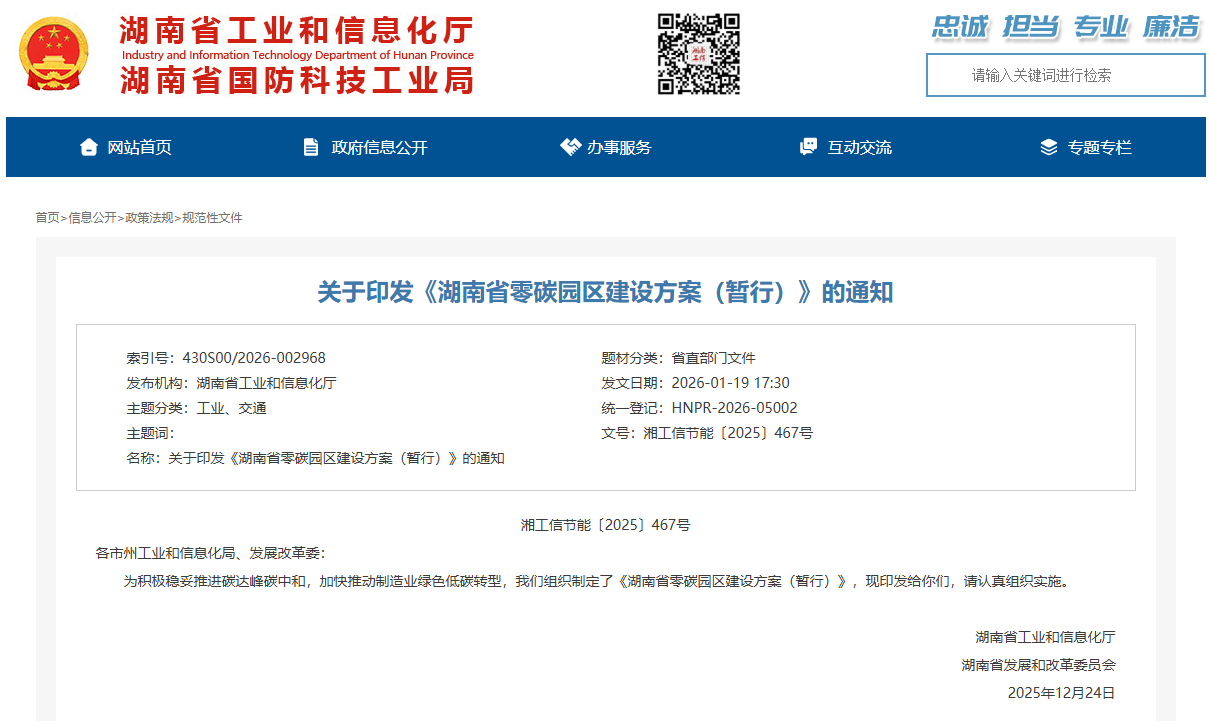 湖南省工信廳印發(fā)《湖南省零碳園區(qū)建設(shè)方案(暫行)》2026-01-21 14:55來源:gessey瀏覽數(shù):218次