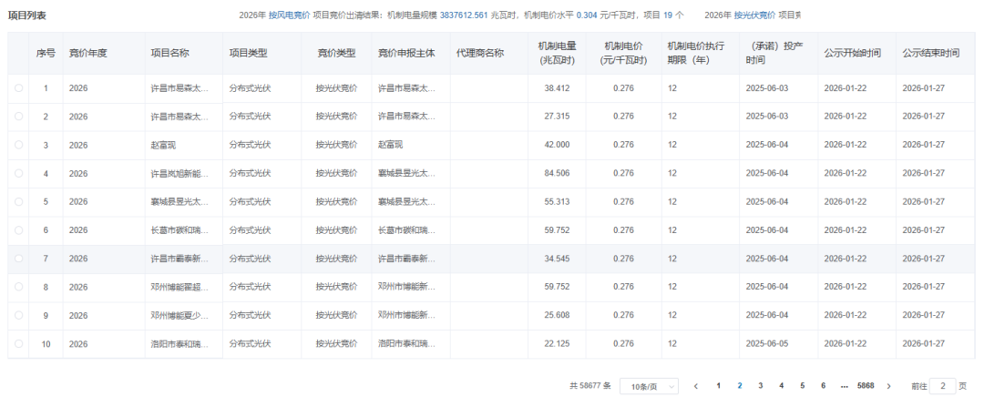 2026年1月22日,國網(wǎng)新能源云公示河南省2026年風、光項目機制電價競價結(jié)果。