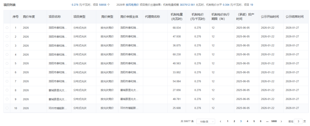 2026年按光伏競價項目競價出清結(jié)果:機制電量規(guī)模2796742.403兆瓦時,機制電價水平0.276元/千瓦時,項目58658個。